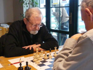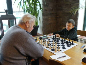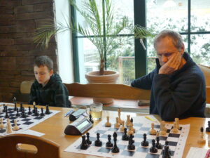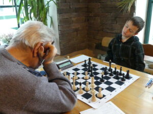 Jaroslav Volf (1953F) – Tomáš Mík (1521F) 1:0 Generační souboj s věkovým rozdílem neskutečných 67 let. Klasicky sicilka s c3 s reakcí černého d5, Jarda nic nekomplikoval, v klidu měnil, až získal ve čtyřvěžovce s aktivnějším střelcem proti jezdci pěšce. Klučina bojoval, po dalších výměnách z toho byl ale střelec na koně s flokem víc. A v podobných pozicích se krom Carlsena neplete ještě jeden hráč 🙂