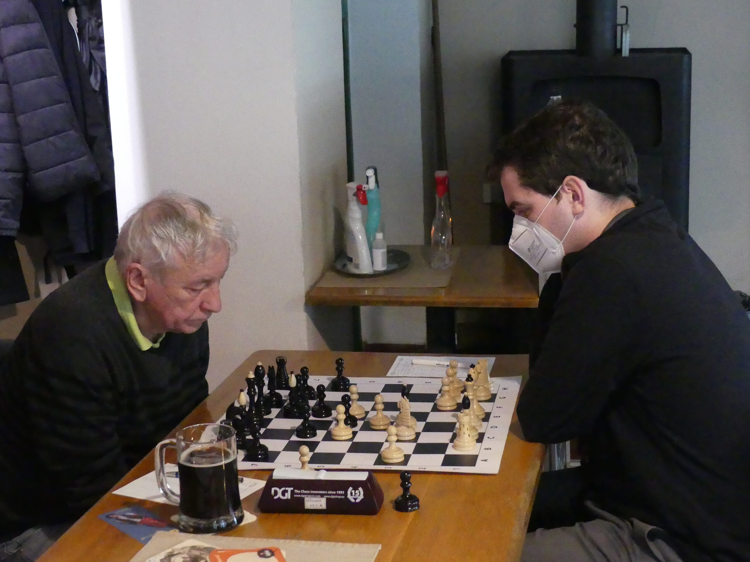 Tomáš Kalous (1854F) – Jan Mareš (1985F) 1/2 Nikoliv překvapivě španělka s brzkým Jd4 – na mě až moc placaté, ale Jendovi podobné pozice nevadí. Náš lídr rychle vyrovnal, měl i lepší čas  a s minimem rizika – proti Tomášovi ideál. Čas se ale postupně vyrovnal, jezdcovka od oka aktivnější za bílého v sobě asi měla mnohá úskalí. Tahalo se dlouho a pilo o to víc, ale nakonec dle očekávání skončilo smírem.