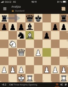 Večeř – Švec 1/2 S třináctiletým klučinou by bylo fajn umět základní pozice otevřených her. Jirka e4 e5 Jc3 Jf6 f4 neznal, po pasivním d6 se dostal do stísněné pozice. Junior mohl v klidu zvyšovat tlak po nekorektní Jirkově oběti na g4, ve stylu romantiků ale nechal po Jg5 viset dámu s tím, že střelec a dva koně upletli věčný šach – Legalův mat se v pozici nekonal. Tady jsme ale byli za půlku sakra rádi…