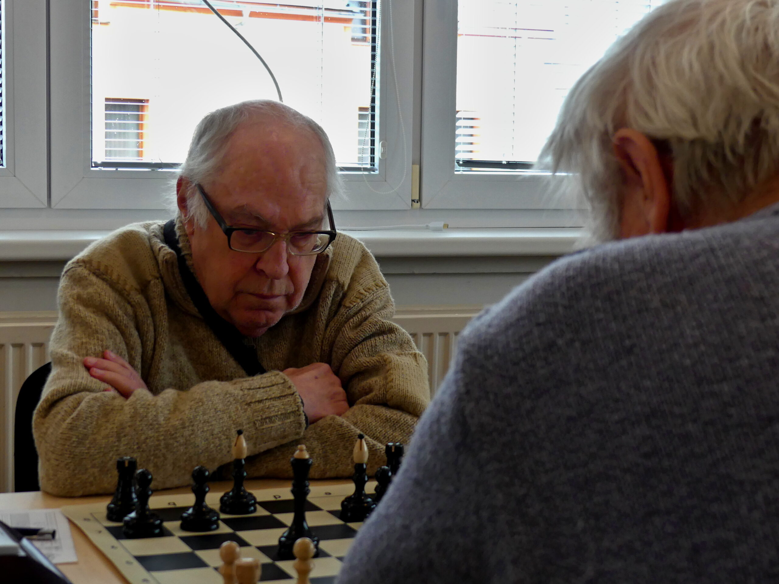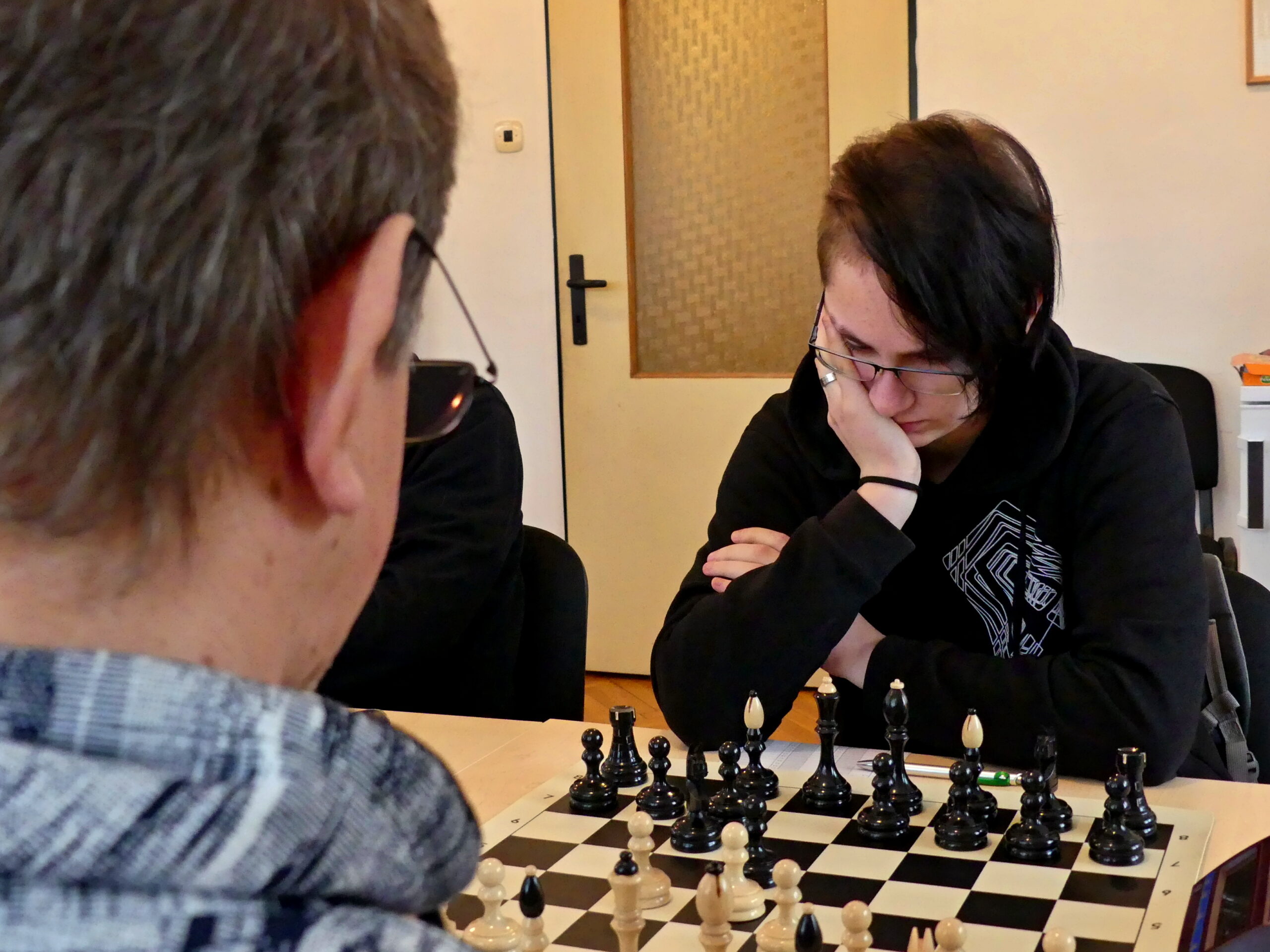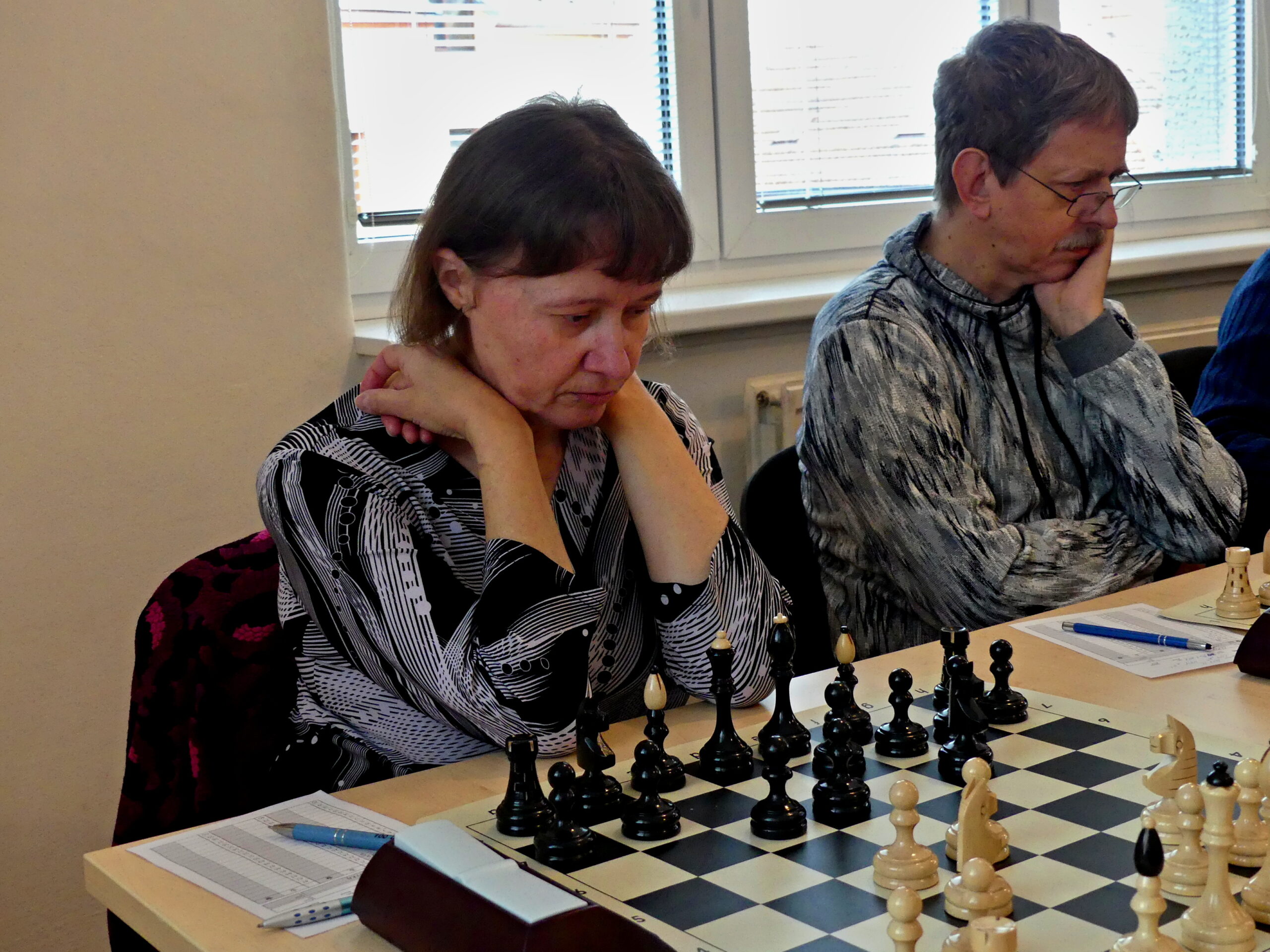 Tam to také postupně začalo sypat, i když trochu méně, než jsme si před výkopem mysleli. Jednobrankovku předvedl náš nestárnoucí exkapitán Bohouš, o vedení jsme nepřišli ani po dalších třech nerozhodných partiích. Kapitán/rozhodčí David, jinak též hráč letohradského áčka, víc než remízu neměl – soupeř ho dost nepříjemně mačkal a druhá nabídka se už odmítala těžko. Za remízu mohla být ráda také Soňa, která mlžila nejdřív se slabinami, pak bez kvality – soupeře k nabídce remíze asi motivovalo výrazné ratingové manko. Půlil taky Jarda na druhé, který měl nejprve lepší pozici, ale výhoda mu utekla mezi prsty a ve zjednodušené pozici už žádné plus neměl. Zabrat tak musel zuřivý reportér na poslední, v docela zajímavé partii vytvořila soupeřka materiální nerovnováhu (2S-V2p), kde ale dominovaly bílé figury.