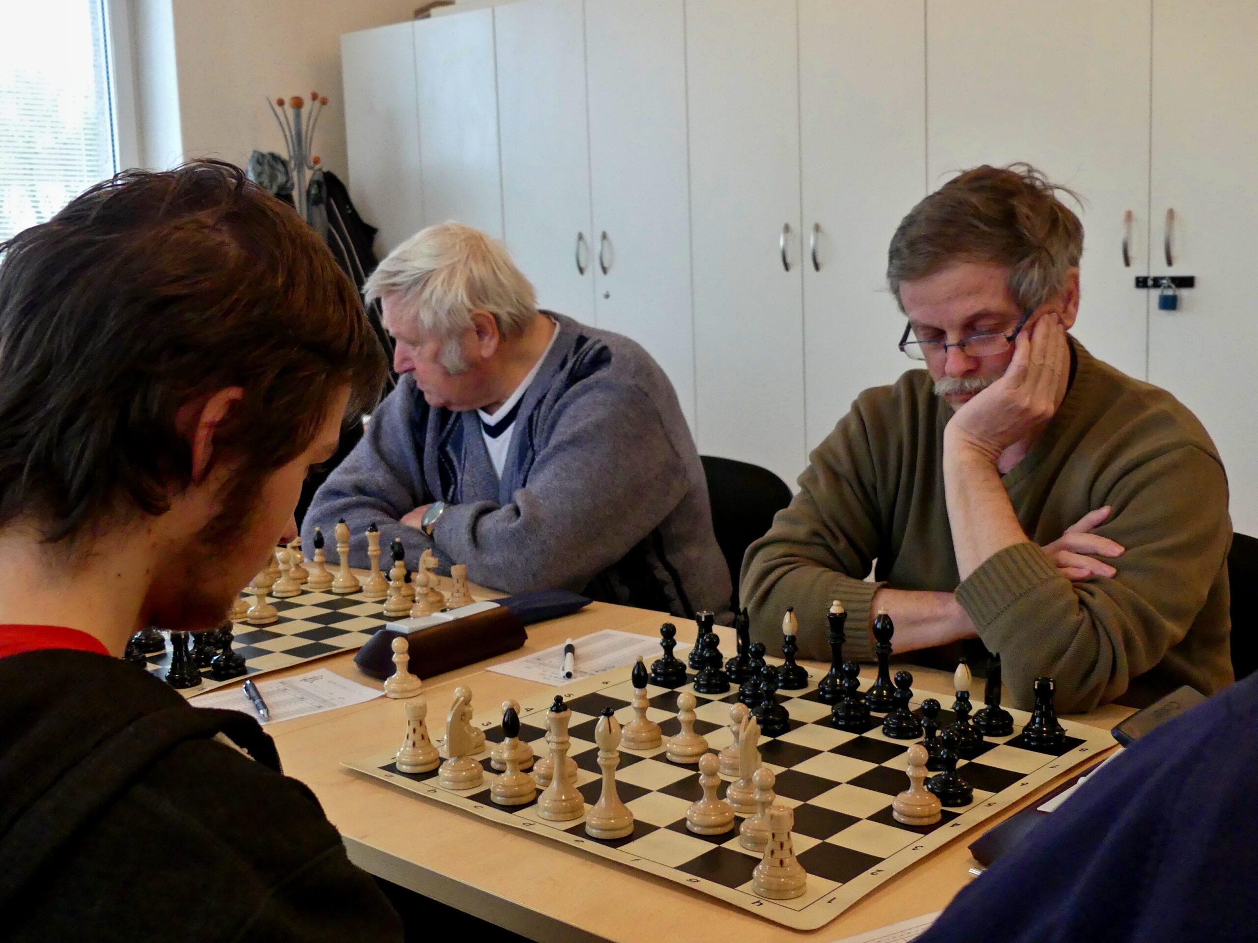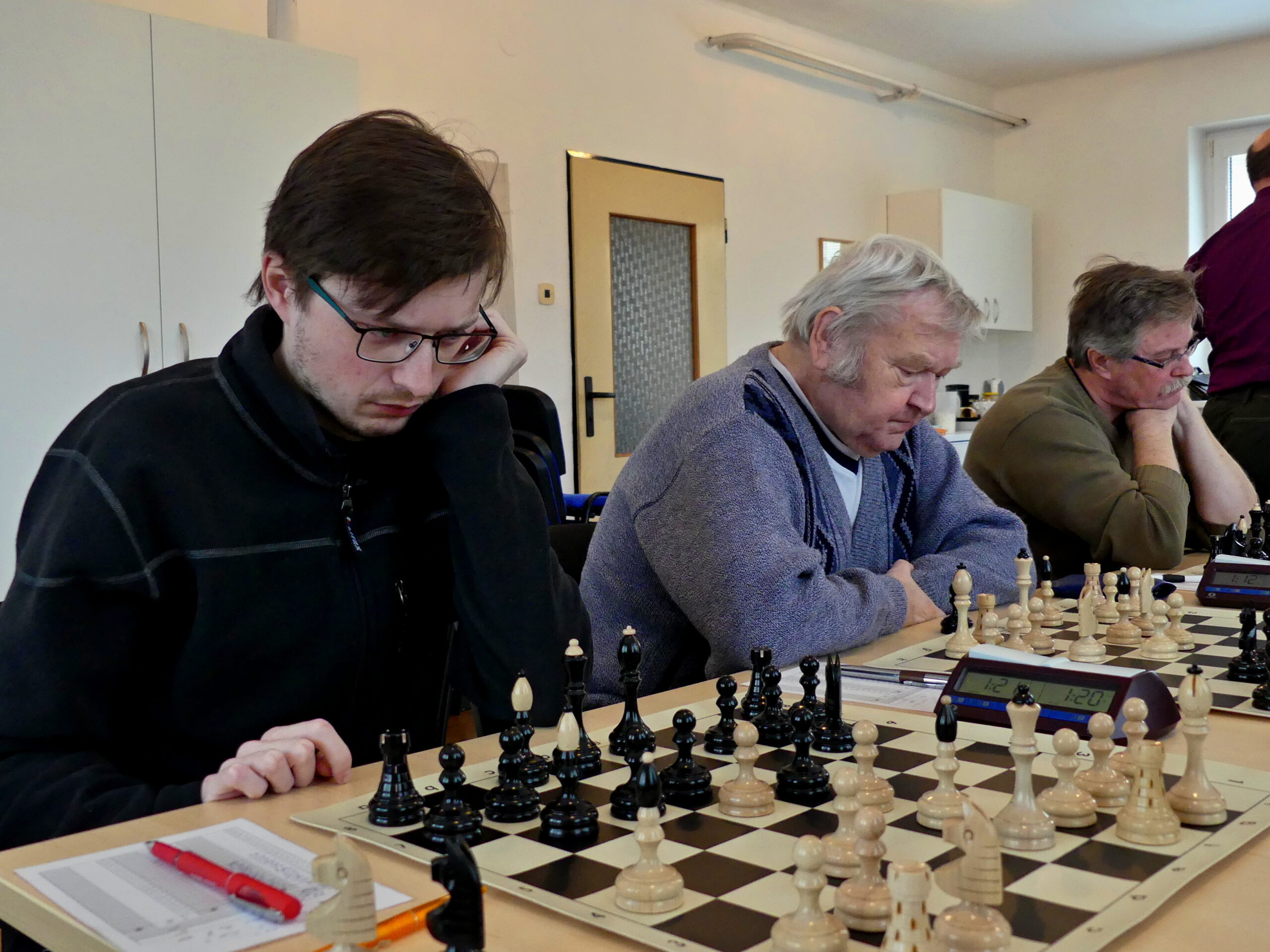 První auto tak odjíždělo za příznivého stavu 3,5:1,5, dohrávaly se tři partie, ve všech dost složité pozice na hraně časovek. Jenda na první zkoušel útočit na krále, ovšem soupeř hrozby vykrýval a materiál už měl na své straně. Starší z Marešových na třetí mladého soupeře mačkal, stálo ho to hodně času. Honza Smola o stůl dál stál určitě lépe, ale musel se postarat o svého krále. Nakonec to pro nás dopadlo příznivě, info dodal telefonicky Petr Mareš. Jeho synátor na první nepochodil – čestný úspěch domácích obstaral lídr Kamil. Na třetí a čtvrté jsme ale pozice k bodu dotáhli.