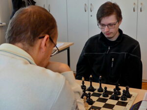 Sysr Vít – Mareš Petr st. 0:1 Od začátku pozoruhodná partie, kdy na domeček nasadil bílý 2.h4!? a náš hráč dlouze dumal. Nakonec (asi) vykoumal zahájení dobře, viděl jsem výraznou černou aktivitu, starost mi dělaly jen minuty na budíku. Na časovku dle Petrových slov nicméně ani nedošlo, protože pod tlakem bílý ztratil figuru a nakonec vlezl do matu.