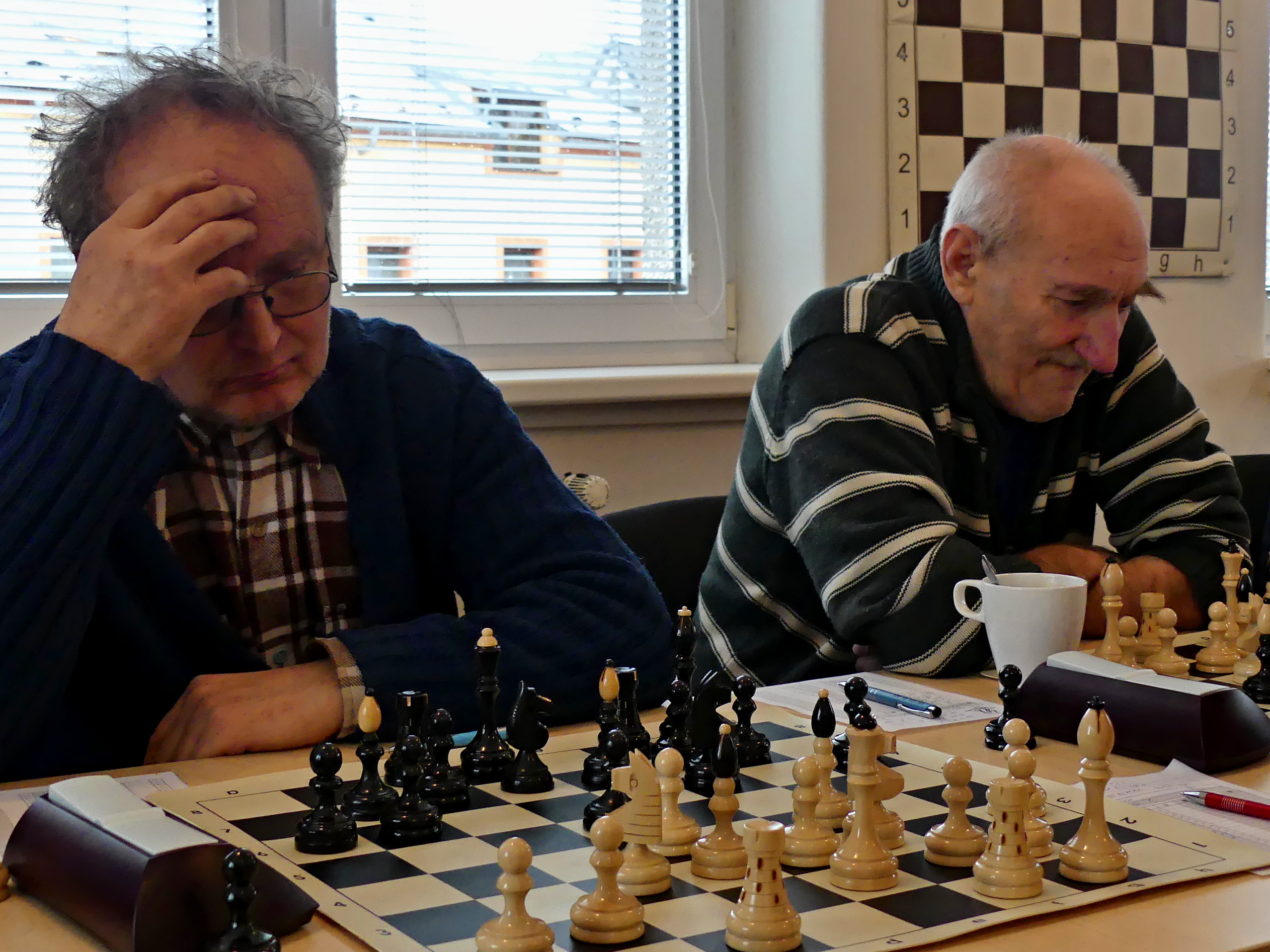 Výsledek 5,5:2,5 průběhu utkání asi odpovídá. Domácí nedali kůži úplně lacino, ale při dvou remízách z lepších pozic mohli těžko pomýšlet a obrat. Tím pádem držíme čelo tabulky, což bychom měli potvrdit za dva týdny doma s Kunvaldem a pak hlavně v závěrečném kole proti Moravské Třebové. Na Žižkově jsem ještě hodinu po obědě zkontroloval kamarády z áčka, kteří dostávali sodu od hradecké Slavie – vzadu sice nepatrně oslabené, nicméně vepředu s úderným triem GM, IM, FM.