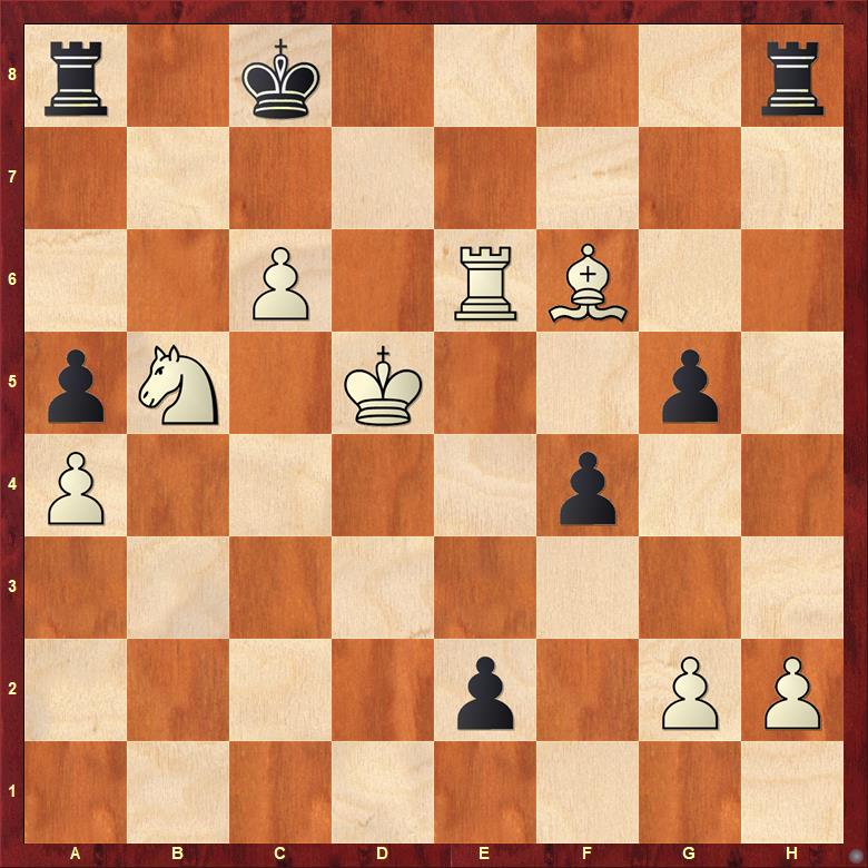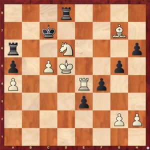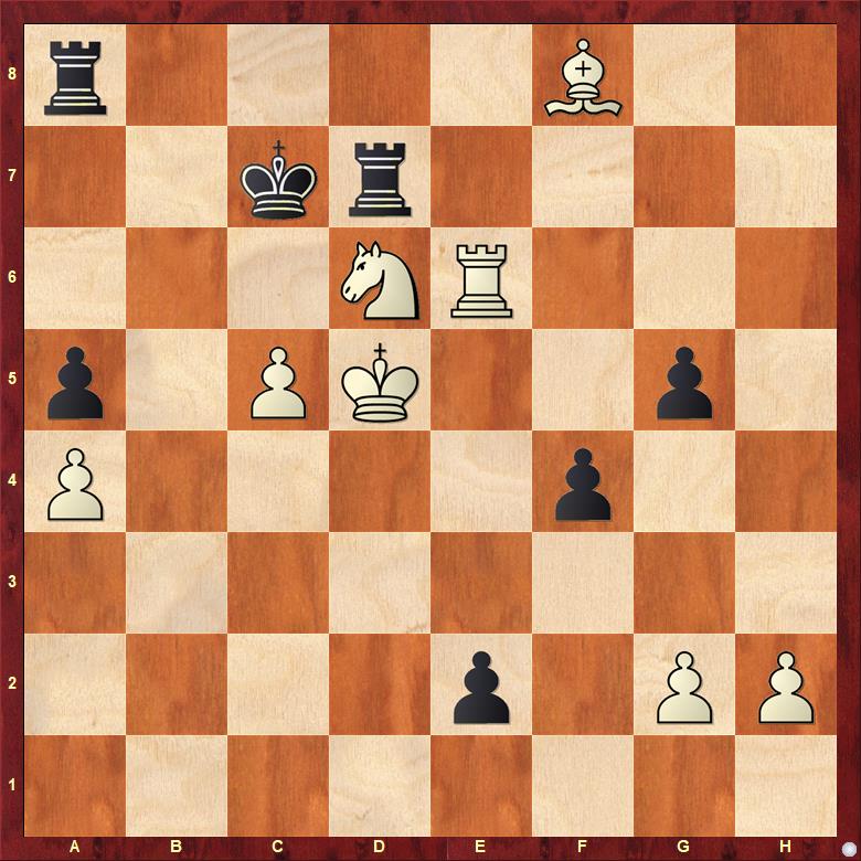 44. c6! Nikam! (45. Se7? Ve8) Černé figury budou definitivně zatlačeny. 44. … Vdd8 45. Se7 Vh8 46. Jb5+ Kc8 (46. … Kb6 47. Sc5+ Ka6 48. Jc7 mat) 47. Sf6