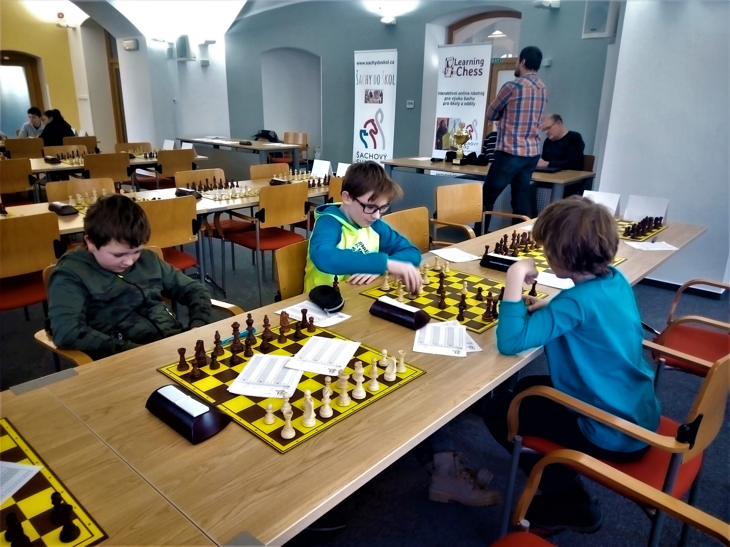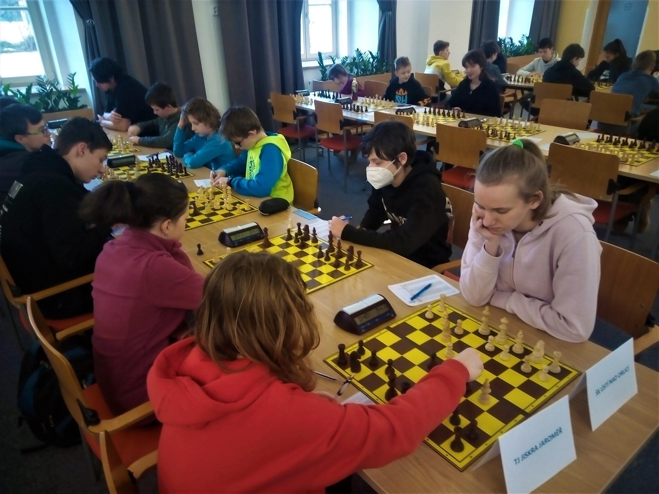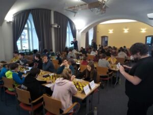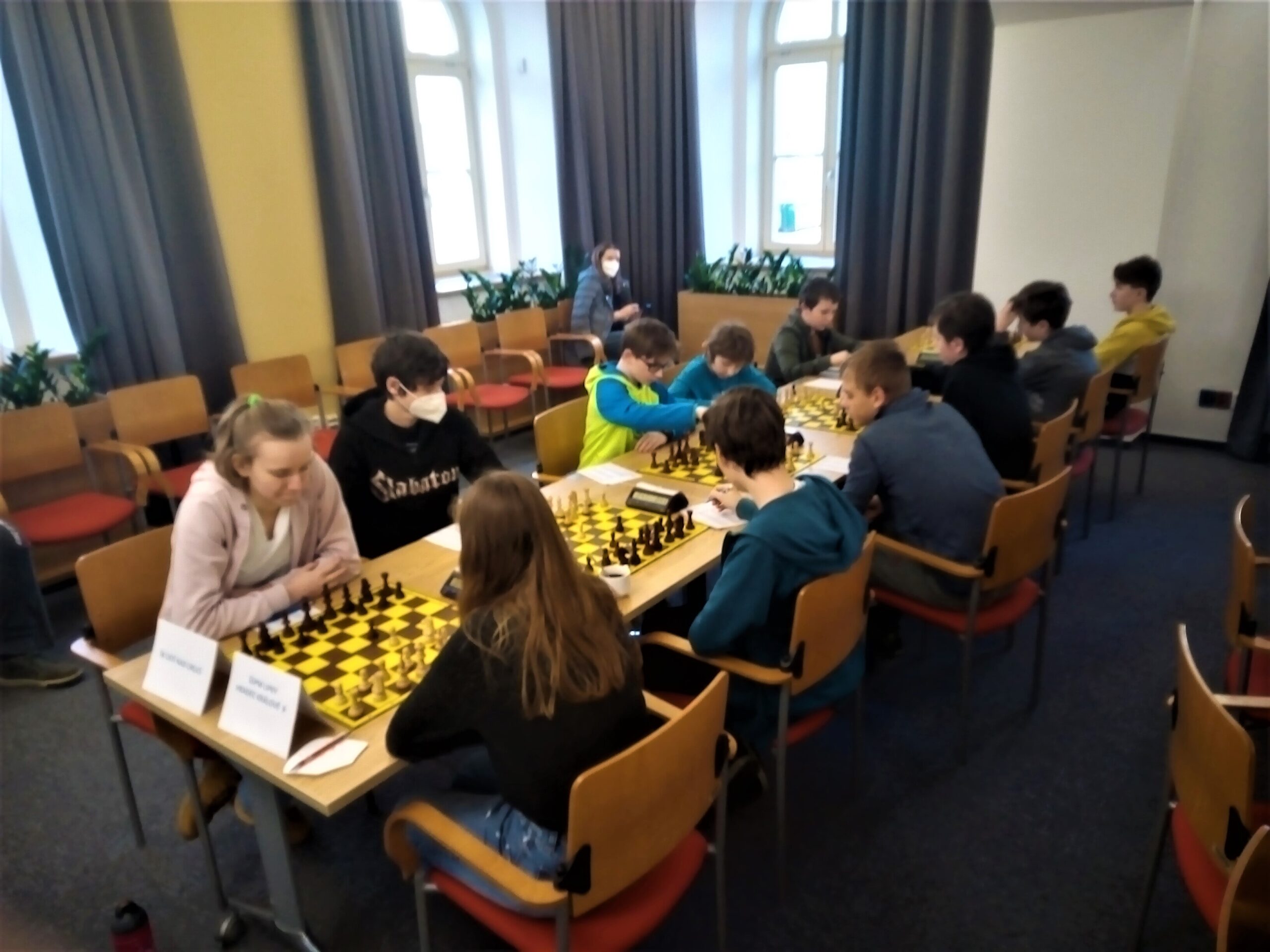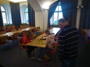 Hrajou se skoro vážné partie tempem 40 min + 30 s/tah, dnes dvě kola, příště taky. Hrálo se na krajském úřadě, atmosféra byla skutečně jako na prestižním turnaji, pánové Šilar a Daniel připomněli, že naposledy se tam hrál přebor tehdy Východočeského kraje před asi 30 lety.