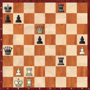 27. Kh2? Skoro nutné bylo 27. g4, ale bylo třeba vidět, že po 27. … h5 má bílý výmluvu 28. Dd7! Se6 29. De7. 27. … fxg3+ 28. fxg3 Vf2+ 29. Kg1 Dxg3 mat!
