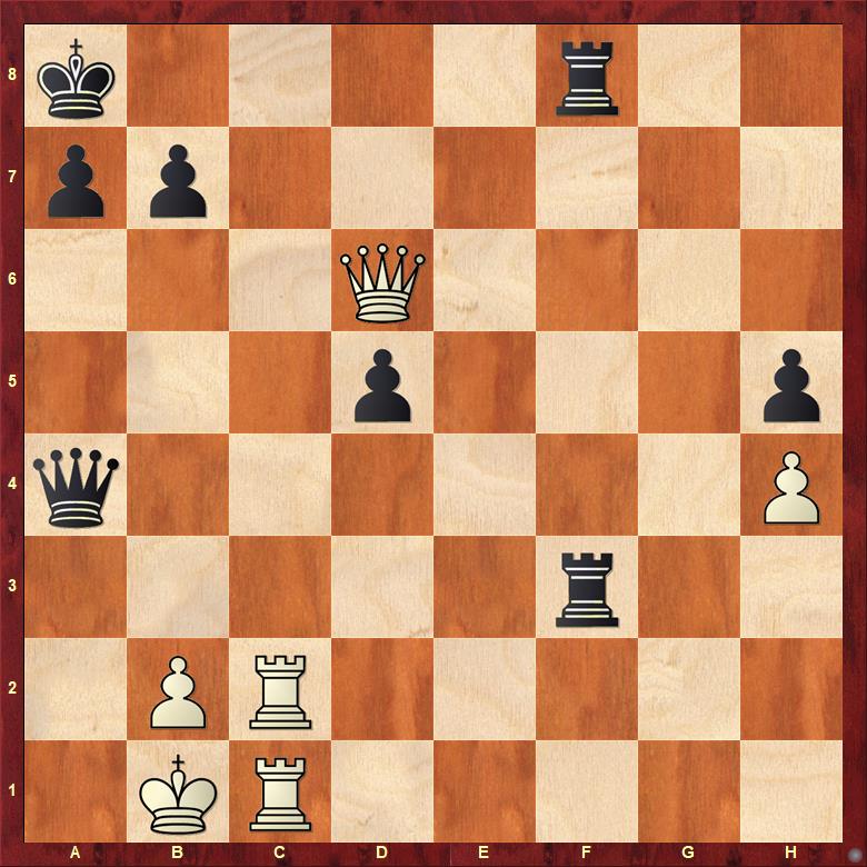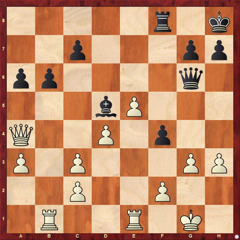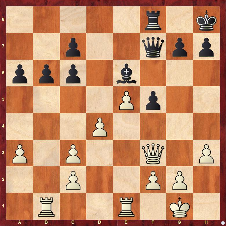Věříte tomu, že bílý za šest tahů dostane mat? 24. Dxc6?! Objektivně je to dobrý tah, ale z praktického hlediska ne. 24. … Sd5 Diagonála! 25. Da4? Tam bude dáma mimo hru. Nutné bylo 25. e6! +-. 25. … Dg6 26. g3 f4! Vítr se obrací. Tohle se za bílého brání strašně špatně.