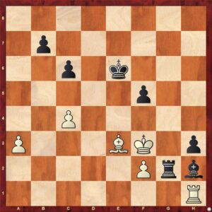 Tohle je pro mladé taky těžké, bílý totiž musí „stát na místě“ a jen tempovat střelcem, což je pro impulzivní hráče psychologicky skoro nemožné. 32. Sf4? vede do prohrané věžovky. 32. … Sxf4 33. Kxf4 Vxf2+ 34. Kg3 Va2 35. Kxh3 Vxa3+ -+.