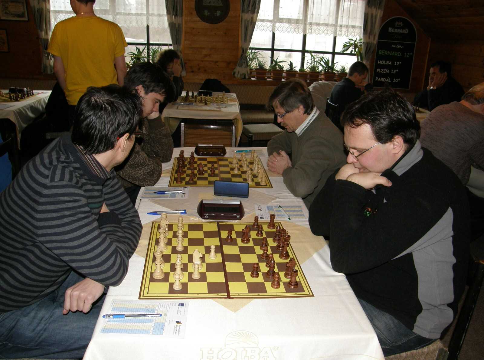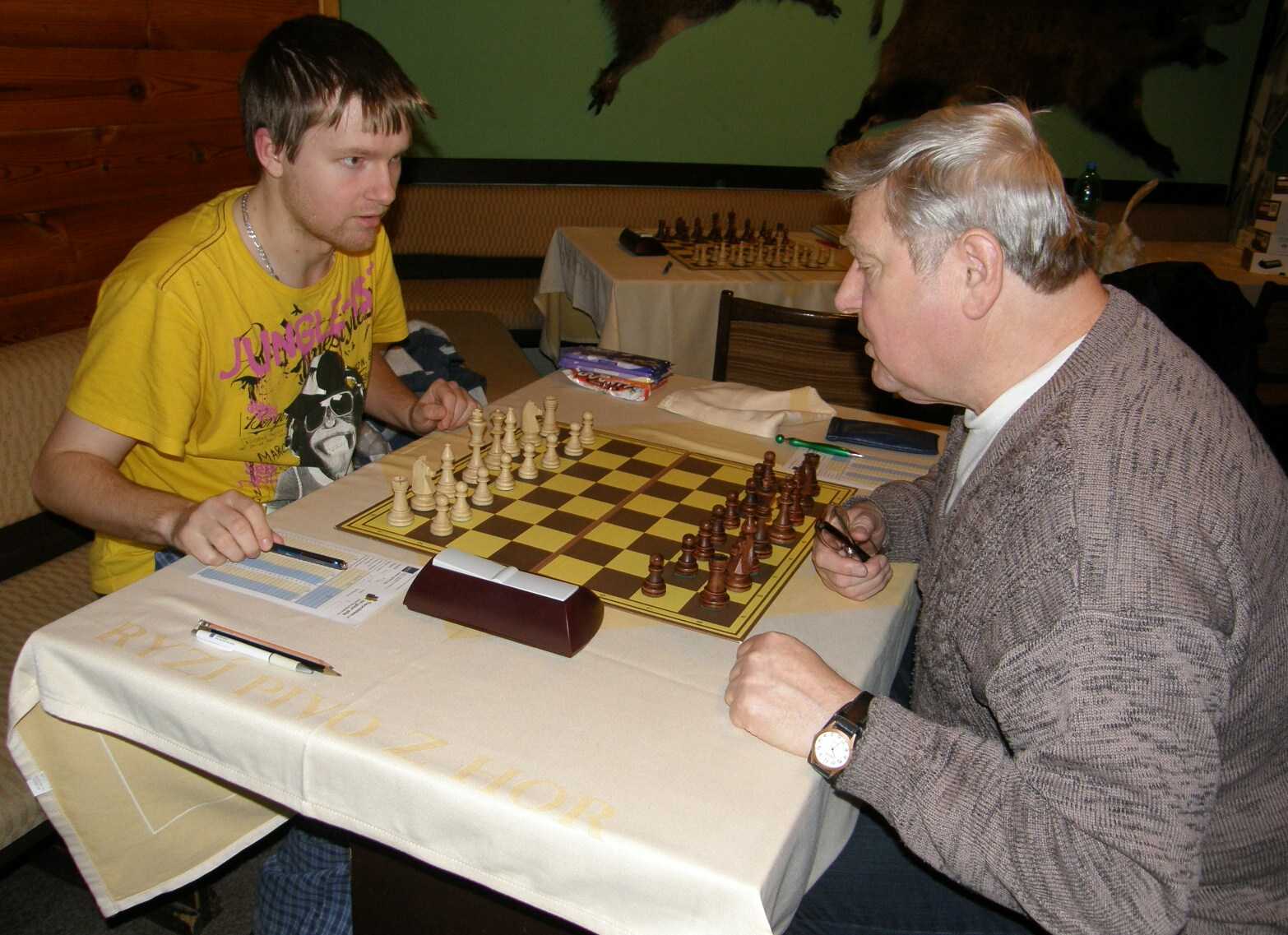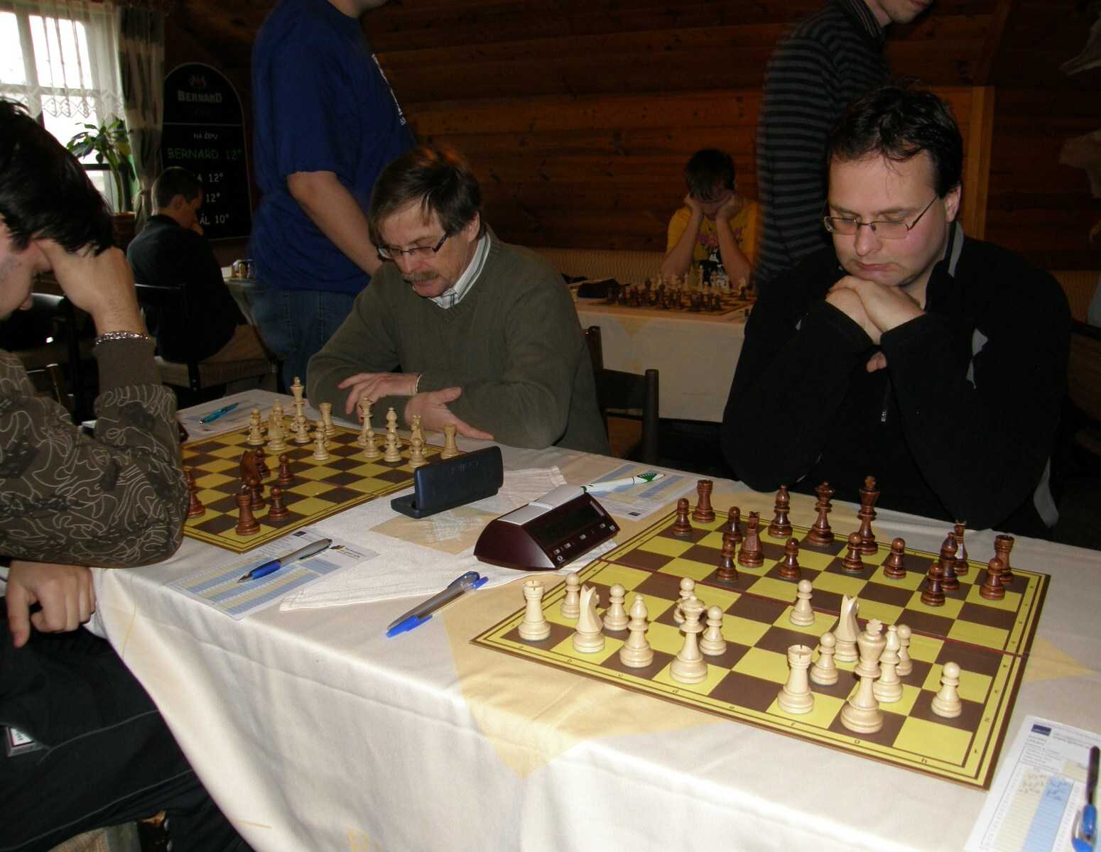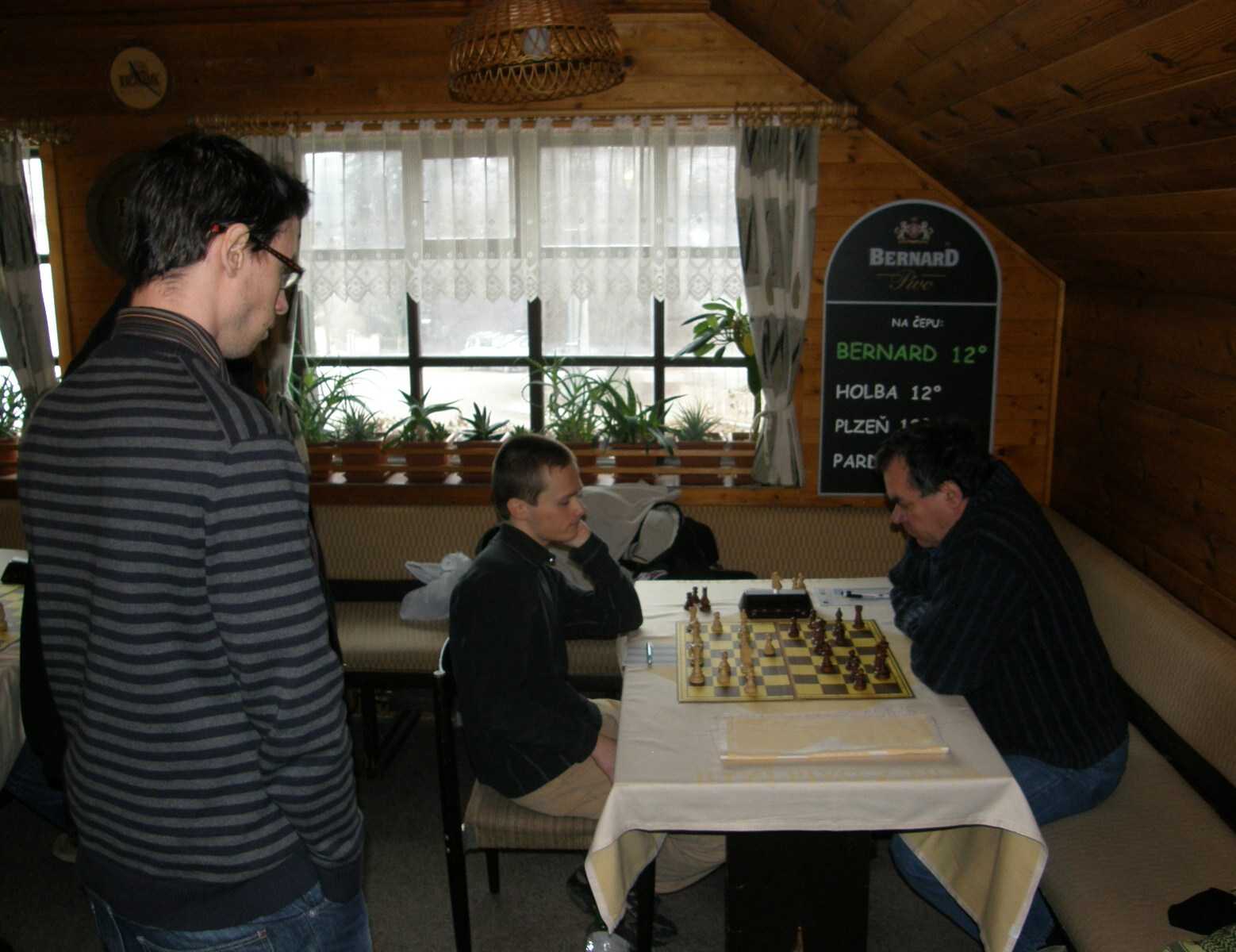 Po zahájení se mi to líbilo u mě, u Martina Poslušného a u Lukáše, horší mi přišel jen Jarda. Jako první byla podepsána půlka na první šachovnici, možnost zahrát si s panem Augustinem Martinovi závidím. 0.5:0.5 Potom otočil svou partii k horšímu Martin Poslušný a bohužel i já. Ve snaze něco ještě vymyslet jsem neviděl, jak krátce po sobě zaznamenal Lukáš bod a Martin nulu. 1,5:1,5 Pak jsem to položil (1,5:2,5), ale zároveň byl už vyhraný Honza Šimek, který zaznamenal bod zhruba ve stejné chvíli jako Pokyn půlku („abych potvrdil to vedení týmu po Lukášově výhře“, tvrdil po partii). 3:3 Ve vrcholících kisnách se bohužel ukázalo, že body nebudou: Jarda podlehl útoku a Petr vylezl ze zápletek bez figury. Za stavu 3:4 sice zahrál koncovku hezky a remizoval, ale celkově to nestačilo. 3,5:4,5