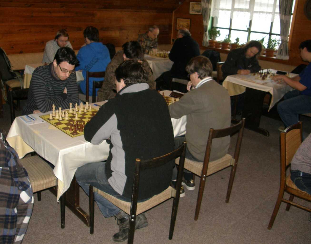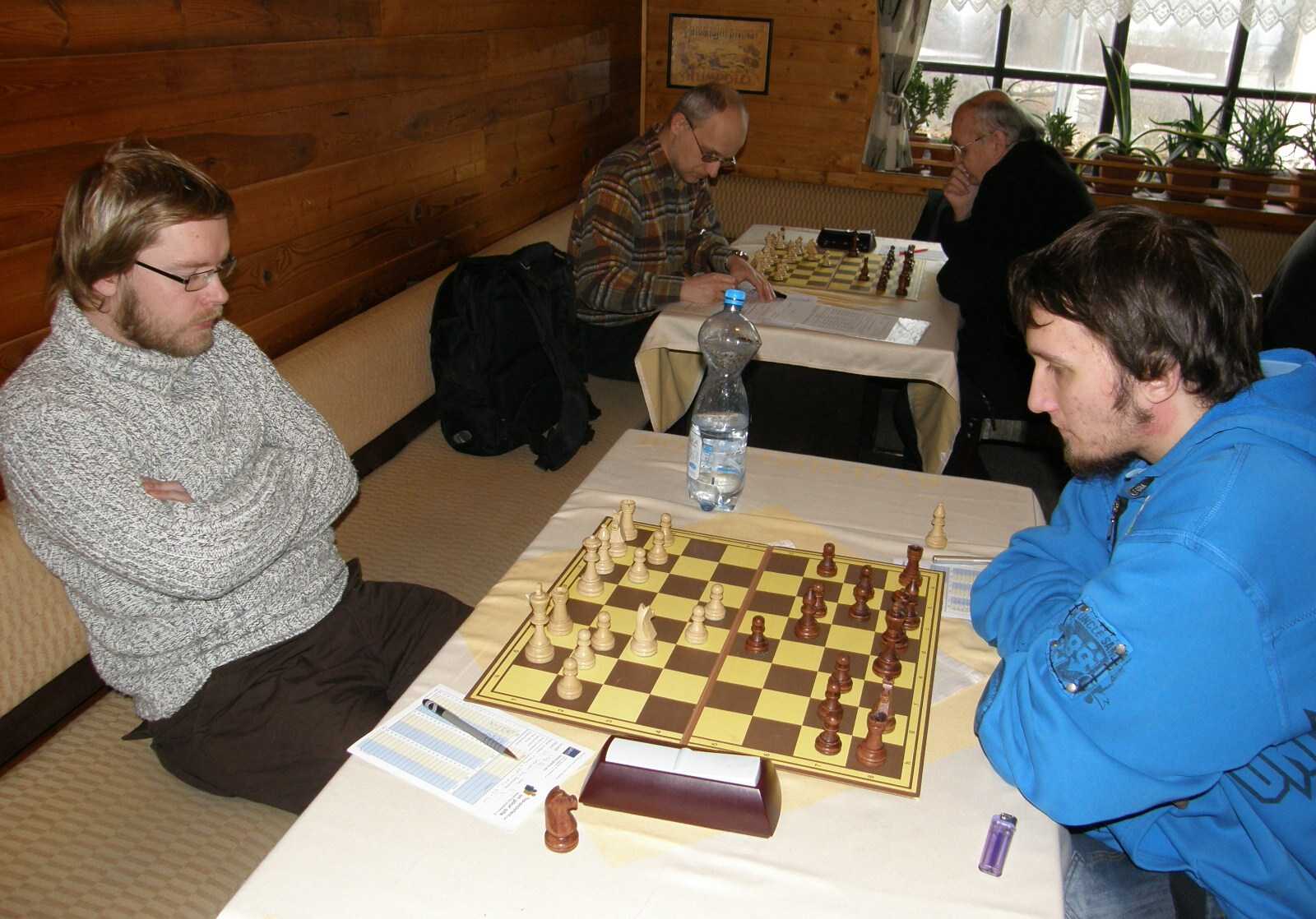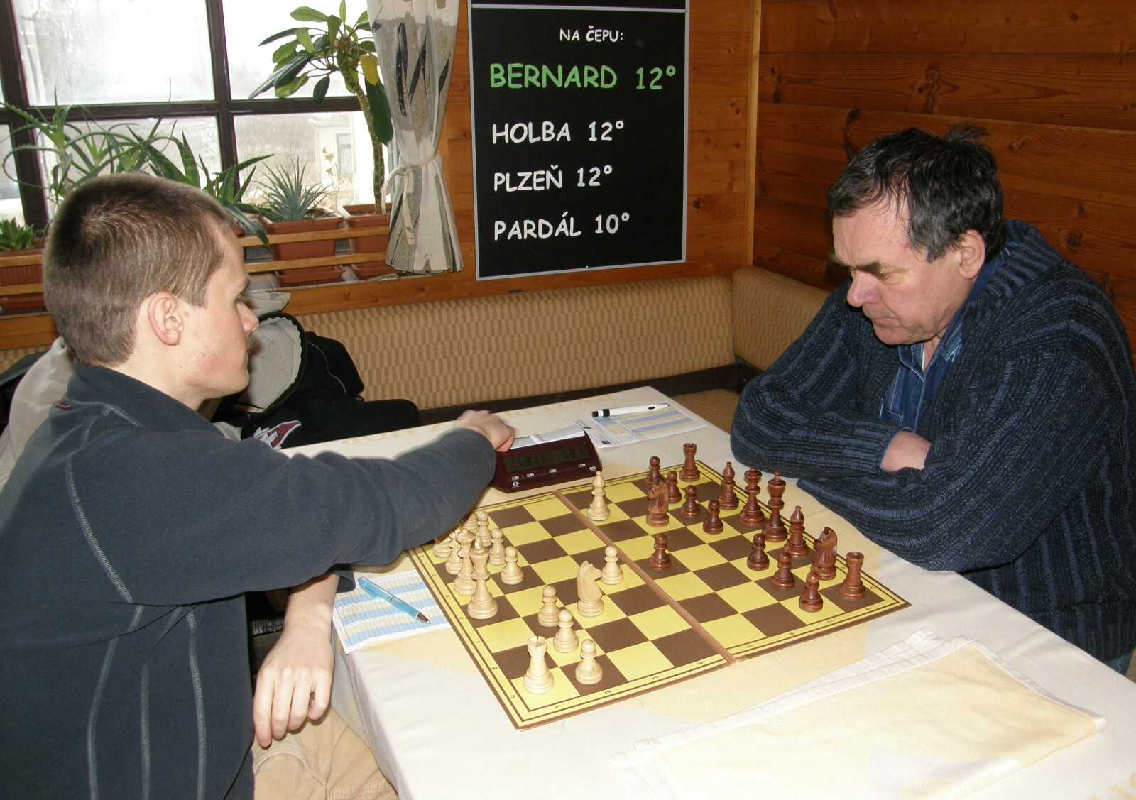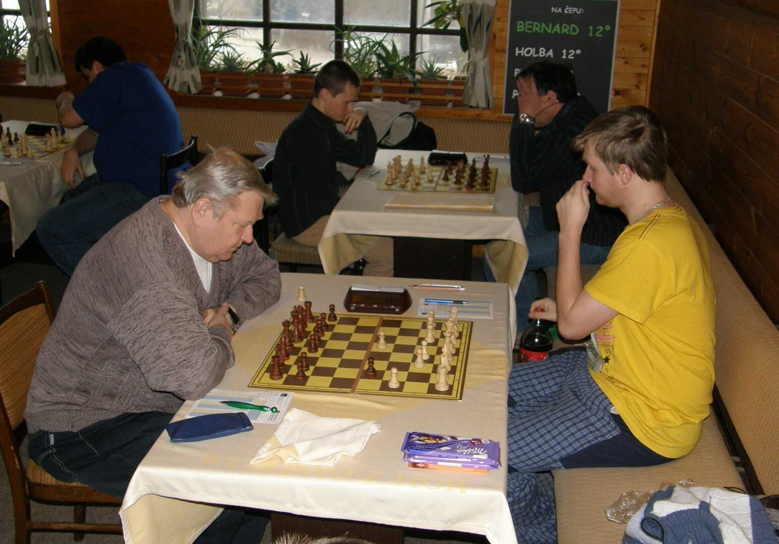 Po zahájení se mi to líbilo u mě, u Martina Poslušného a u Lukáše, horší mi přišel jen Jarda. Jako první byla podepsána půlka na první šachovnici, možnost zahrát si s panem Augustinem Martinovi závidím. 0.5:0.5 Potom otočil svou partii k horšímu Martin Poslušný a bohužel i já. Ve snaze něco ještě vymyslet jsem neviděl, jak krátce po sobě zaznamenal Lukáš bod a Martin nulu. 1,5:1,5 Pak jsem to položil (1,5:2,5), ale zároveň byl už vyhraný Honza Šimek, který zaznamenal bod zhruba ve stejné chvíli jako Pokyn půlku („abych potvrdil to vedení týmu po Lukášově výhře“, tvrdil po partii). 3:3 Ve vrcholících kisnách se bohužel ukázalo, že body nebudou: Jarda podlehl útoku a Petr vylezl ze zápletek bez figury. Za stavu 3:4 sice zahrál koncovku hezky a remizoval, ale celkově to nestačilo. 3,5:4,5
