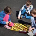 Už se dal využít i dvorek, závody ve skoku na jedné noze a v běhu vyhrála Bětka před Tobíkem a přede mnou (ale jednou jsem Tobíkovi stačil!), zkusili jsme i soutěž paměť/běh (úkolem bylo postavit na druhé vzdálené desce stejnou pozici jako na první).