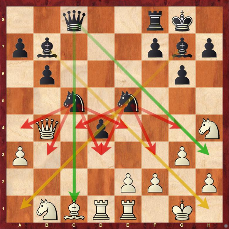 Tady je celkem náhodně vybraná pozice z partie Gonzales – Andersson, 1980. Černý má o kvalitu méně (za pěšce), ale figury mu hrají skvěle (podívejte se na ty šipky). Naopak bílý má oba jezdce mimo hru, věže jsou omezeny svými i soupeřovými figurami, dáma sice hraje, ale je zranitelná. Černý má už velkou výhodu. (A realizoval ji po 22. … d3! 23. e4 a5 24. Dxb6?! Jc4 25. Db5 Sa6 a dáma je chycena. To už je taktika, ale umožnily ji právě skvěle hrající figury.)
