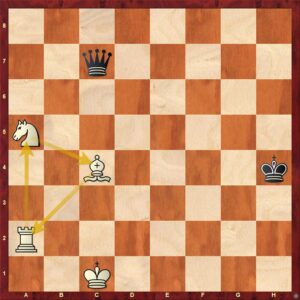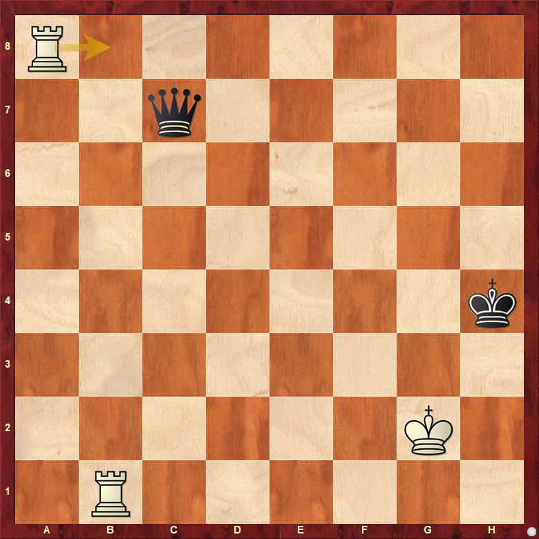Bílé věže jsou nechráněné, černý na tahu je může snadno vyšachovat (např. 1. … Dc6+ nebo 1. … Dc2+). Je třeba je spojit, bílý na tahu zahraje 1. Vab8! (nebo 1. Vba1, příp. i 1. Vaa1 nebo 1. Vbb8), tím jsou věže v bezpečí a bílý asi bude šachovat až do remízy, jinak by taky mohl dámu ztratit.
