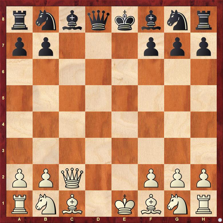 Tohle je na první pohled podobné, ale pozice je asymetrická, takže bílému by se snadněji útočilo na královském křídle, černému na dámském (je to složitější, ale to teď necháme stranou). Zkuste třeba bílé figury naskládat na dámské křídlo, např. Da4, Sb5, Sa5, Jc3, Vb3 apod. – co by tam dělaly?