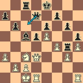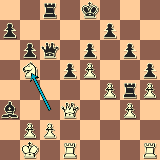 … a po naší kulturní vložce můžeme už představit řešení: 22. … Vxg3!! Zdánlivě chycená věž zasazuje smrtící úder (jako ve slavné partii Tarrasch – Lasker, viz Veselého Psychologického průvodce). Věž brát nelze (Dxc2+ a Dxb2 mat), po asi nejlepším 23. Jxa7 Vxd3 24. Jxc6 Vxd1+ 25. Vxd1 Vxc6 26. bxa3 je věžovka jasně vyhraná pro černého, bílý má příliš mnoho slabin. Nestačí ale dámou ustoupit? Ne, po 23. De2?! přišla třešnička na dortu 23. … Ve3!! Přetížená dáma neudrží pc2 i Jb5 zároveň, po nějakém 24. Dd2? Dxb5 má navíc černý kromě figury i matový útok. 24. Jd4? Ve srovnání s tahem Jxa7 nechává černému ještě jednoho pěšce. 24. … Vxe2 25. Jxc6 Vxc6 26. bxa3 Vcxc2 -+. (Jiná věc je, že jsem to pak nevyhrál, protože mi spadl praporek; jenom remis.)