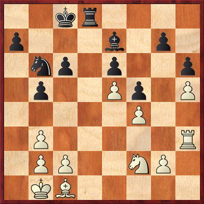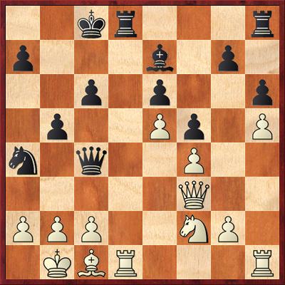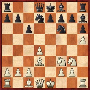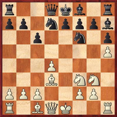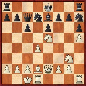 9. … Jgf6 s tím, že jsem považoval pozici s De2 lepší než teoretické Sxd3, které vede ke stejné pozici, akorát s dámou na d3. Taky jsem nechtěl kopírovat vedle se odehrávající partii Pokyn-Kraus. Jak se ale ukázalo, De2 stojí ještě lépe, než na d3 a celé zahájení tahám za kratší konec.