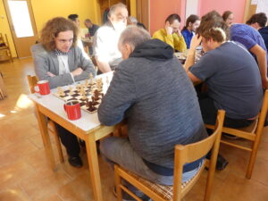 Samostatnou epizodou je svitavské sluníčko, které opět nezklamalo a notně posílilo družstvo domácích o několik dalších „hráčů“. Dolfovi v dobrém sděluji, že takhle teda ne… pročež se nám vedle pozic mění i pozice stolů 🙂 Nejprve na dvojce Netík, pak o kus vlevo Holy, následně po zahájení o tři metry dozadu já – což mi přináší strategickou výhodu, neb sympatický soupeř si posteskne, že na něj táhne od dveří 🙂 Předtím mi obětavě nabízel brýle proti slunci, hele to nevymyslíš, leda ve Svitavách…