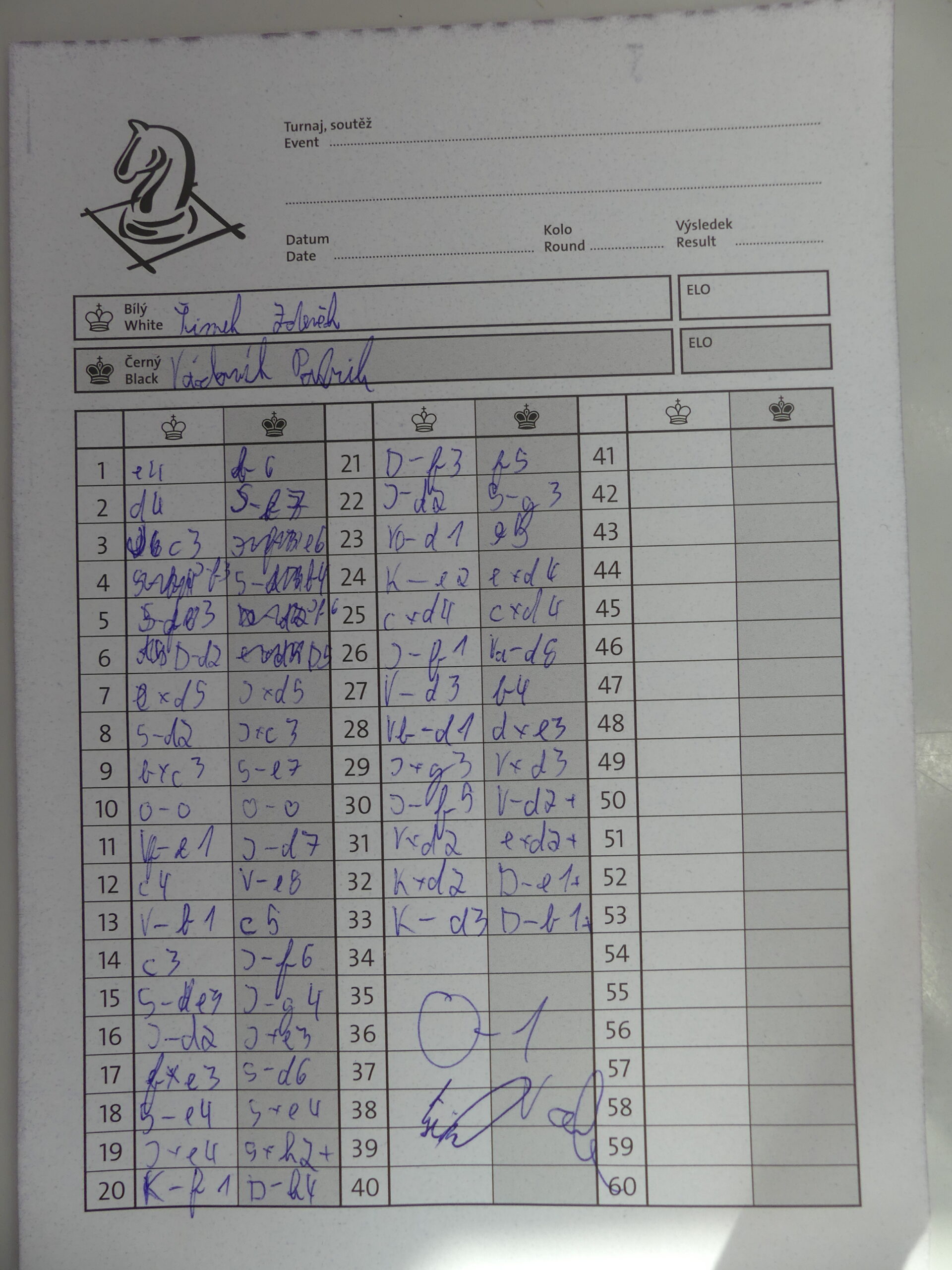 Ale měl jsem pocit, že mnozí jsou na tom velmi podobně. Laciné ztráty pěšců na deskách 3-5, problematické zacházení s časem … zápas jsme moc pod kontrolou neměli a výsledek je opravdu s klikou jako hrom.