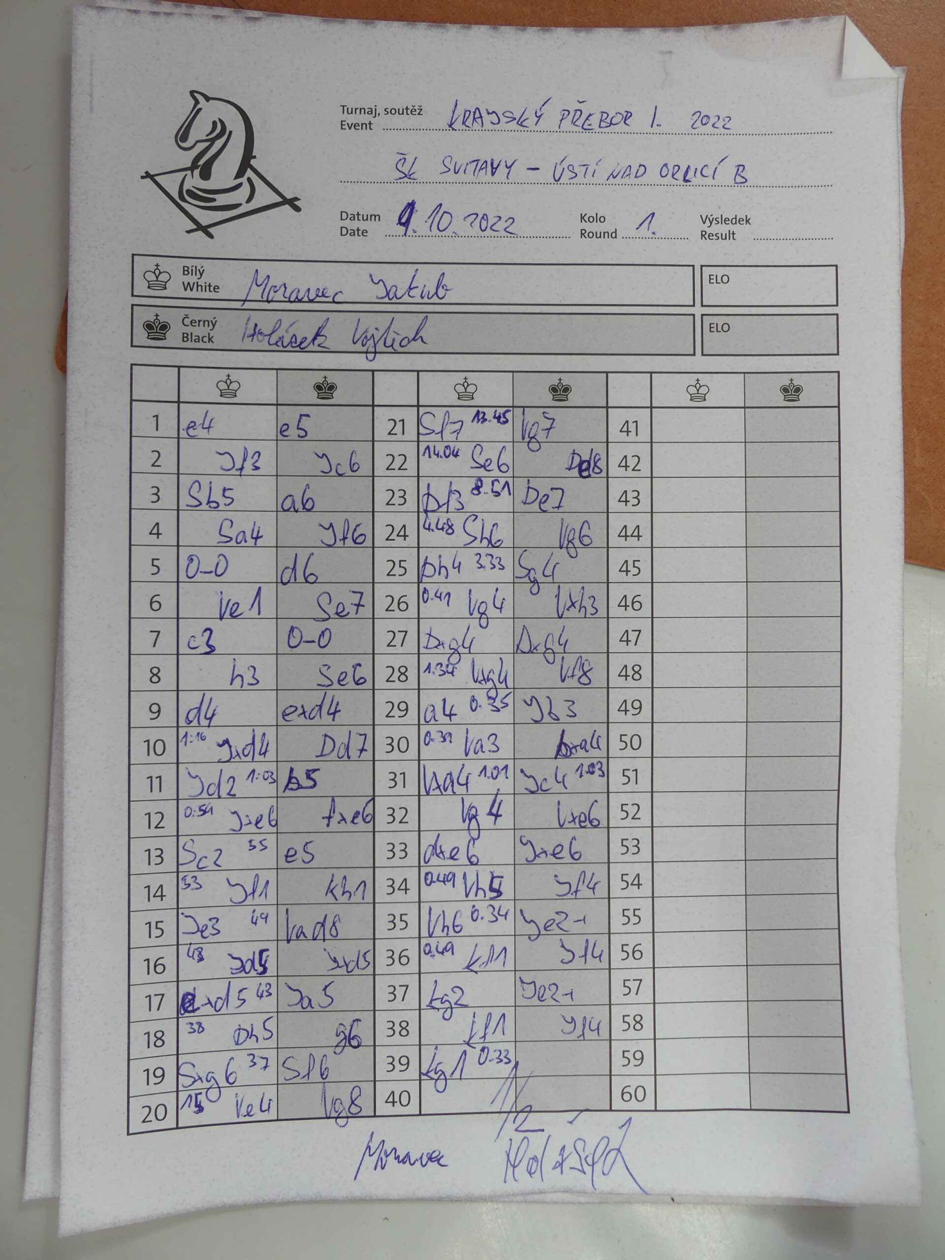 Moravec – Holásek Vojtěch 1/2 Docela solidní zavřená španělka, černý neztratil pe5, jak se mu už kolikrát stalo. Našemu papírově silnějšímu hráči fandil do chvíle, než se mu bílý proobětoval přes g6. Pak bych na něj nevsadil ani ruskou armádu na Krymu, nicméně Vojta umí šejdit úplně jinak než já – i bez kvality vybudoval pevnost, s níž si bílý nevěděl rady… a tak kluci podepsali remízu. Za nás maximální zisk!