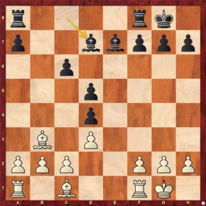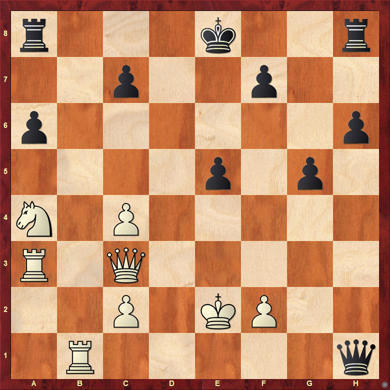 Tady může černý zahrát 27. … De4+ a má za figuru kompenzaci – bílý král je slabý a pěšců do koncovky má černý dost. Přišlo však 27. … Dxb1? a po 28. Dxe5+ je zle, nejde jen o materiál, ale hlavně o černého krále. Černý ještě zahrál 28. … Kf8?!, což je možná dobře, protože bílý uviděl zisk dvou věží, a nesnažil se proto matit. 29. Dxh8+ Ke7 30. Dxa8?! +- Po přesnějším 30. Ve3+ byl pětitažec, přesto má bílý věž a střelce navíc. – Jo a tuhle partii pro změnu vyhrál černý.