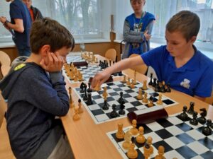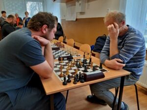 Naše ambice se odvíjely od toho, jestli bude mít junior den, minimálně půlka soupeřů na druhém prkně byla ratingově silnějších. Nicméně Marian se nezalekl, favority trápil a rozdával spíš tam, kde nemusel 🙂 Po úvodním hladkém vítězství jsme „jen“ s odřenýma ušima remizovali – kluk po statečném boji podlehl a já na minutě proti minutě bez přídavku v potu tváře realizoval převahu. Tady bych měl snad jedinou minivýtku k jinak bezvadnému turnaji: pokud jsou „digibudíky“, což v Hlinsku byly, je tempo bez příhozu (2 ×15) nesmyslné. Jednak některé partie v závěru nutně utrpí, za druhé to generuje další problémy, například reklamaci remízy pod dvě minuty, což malí a mladí většinou neví. Zkrátka za rok bych to viděl na 12+3, při sedmi kolech klidně i 15+5, a není co řešit…
