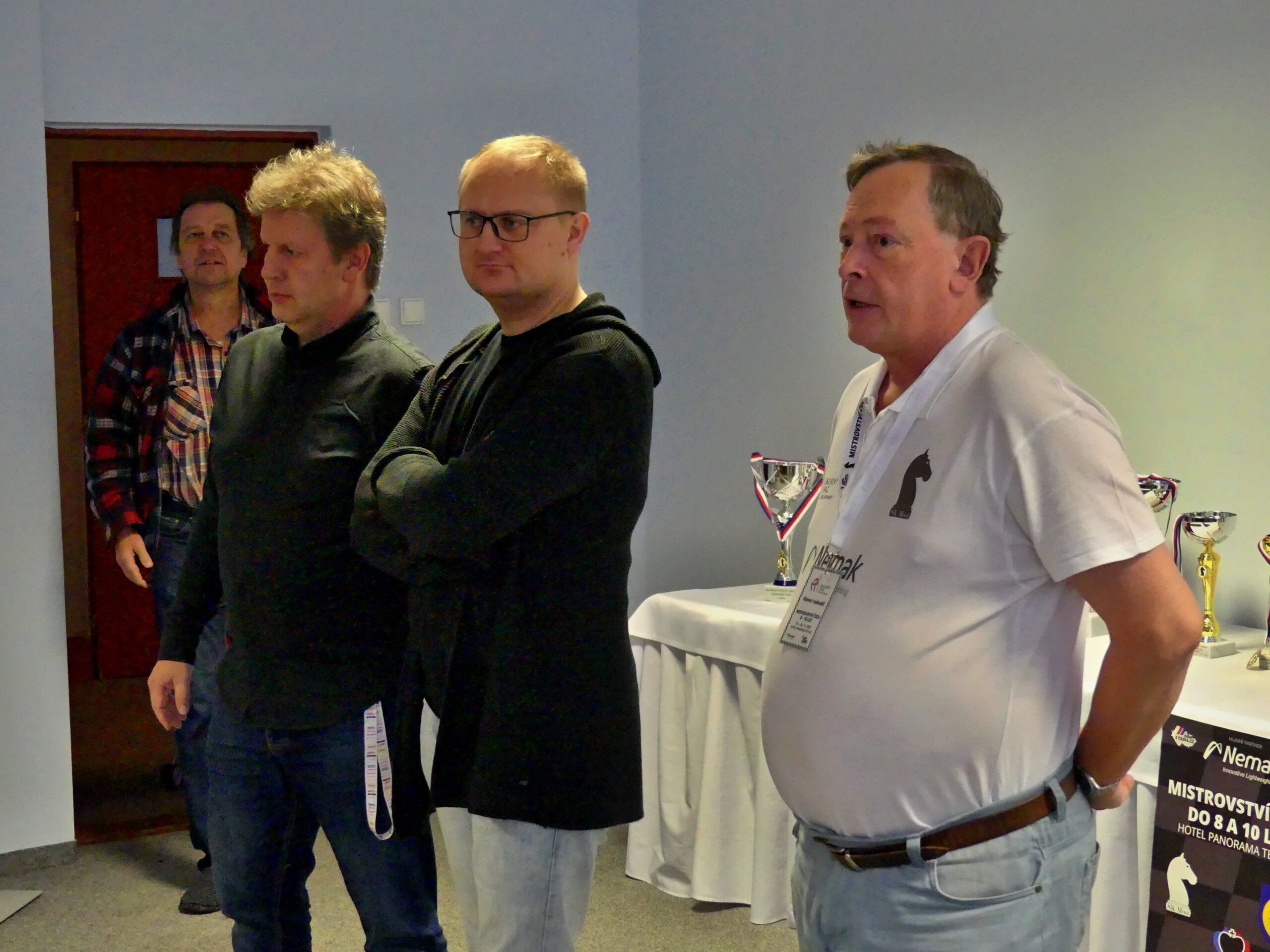 V desítkách se stylově bojuje na poslední, tedy první šachovnici. Zatímco u nás už je tedy jasno… nebo není? Míra Körschner totiž mladičkého soupeře v další dlouhé partii udolal a já měl za to, že na pomocné bude lepší, tudíž první. K (asi nejen) mému překvapení/zděšení máme všechna pomocná hodnocení úplně shodná, přestože jsme shodné soupeře ani výsledky neměli. Co se bude dít na vyhlašování, opravdu netuším, nicméně perfektní pocit od A do Z z celého turnaje to v nejmenším ohrozit nemůže…