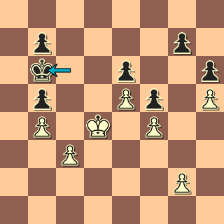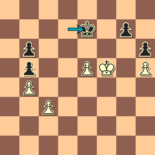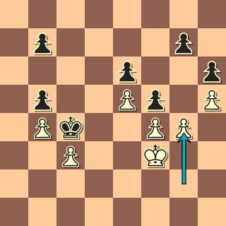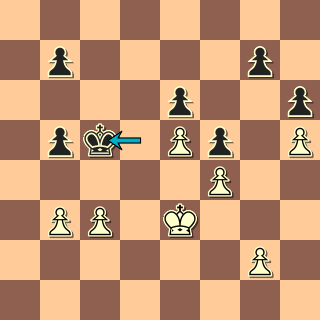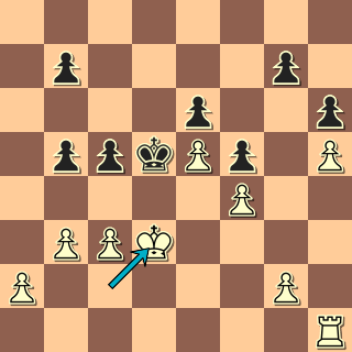 Klíčový postup všech variant, je třeba správný timing! 45. … fxg4+ 46. Kxg4 Kd5! (ano, po 46. … Kxc3 47. f5 by bylo jasno) 47. Kf3 b6 48. Ke3 Kc6 49. f5 exf5 50. Kf4 Kd7 51. Kxf5 Ke7