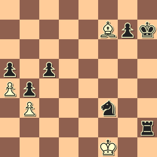 Dost typický obrázek z dětských soutěží. Vyhrát to není kumšt, jenže na chybu je vždycky dost příležitostí. 1. … g6? Ne, ještě se nic neděje, ale trenéra černé už omejvají, protože si dovede živě představit, co bude následovat. 2. Sxg6+! Hezké, ale neměla by se černá jen útrpně usmát? 2. … Kxg6?? Ne. Hráno podle zásady „táhneme okamžitě první tah, který nám padne do oka; nad následky zásadně nepřemýšlíme“. 🙂 Pat. 1/2