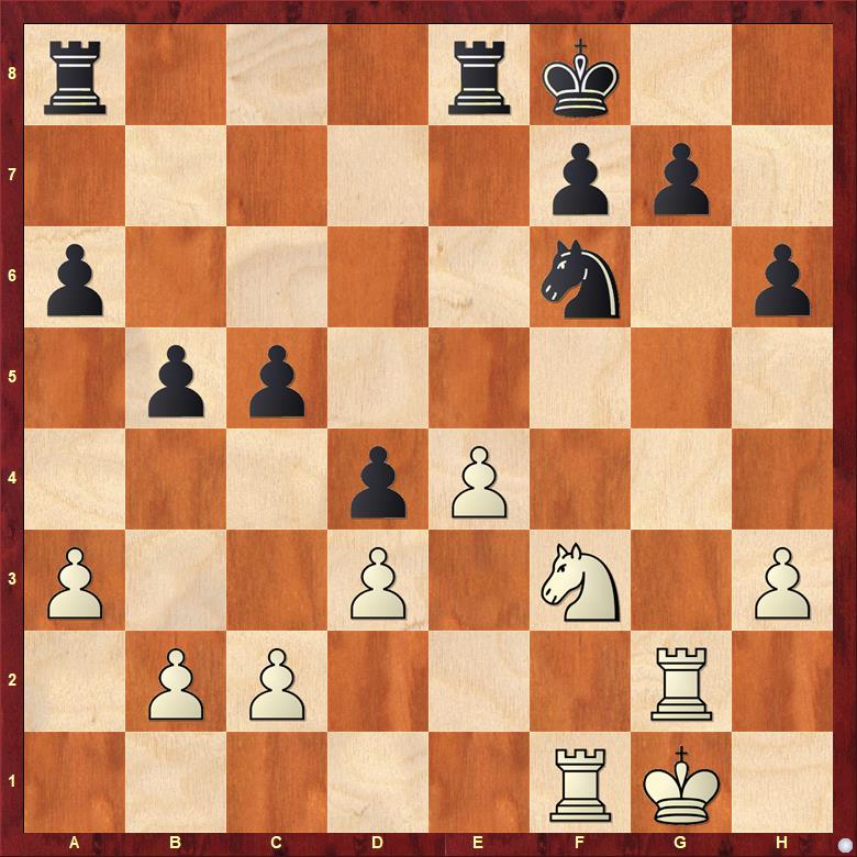 Na pohled normální technická pozice, ale je to vlastně úloha: pomocný mat druhým tahem. Tomáš sice přehlédl pěšce, ale měl za něj jistou kompenzaci v aktivních figurách. Kupodivu měl i výrazně lepší čas, černý už byl někde na minutě. Tady Tomáš zahrál 1. Jh4 a objevila se hrozba Jf5, nejde pak g6 pro Jxh6 (pěšce lze po Jf5 krýt tahem Jh5, ale to se úplně nechce). Černý proto profylakticky ph6 pokryl 1. … Jg8?? a obratem přišlo šokující 2. Jg6 mat! Kdo by to v pozici na diagramu čekal?