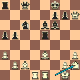 Tady jsem promeškal další dobrou šanci. Bílé figury se totiž příliš vzdálily od královského křídla, takže bylo možné tahem 27. … f5 začít „hrát po celé šachovnici“. Přitom o tom motivu vím a několikrát jsem na něj koukal, ne však právě tady. Ale zase ani 27. … Sd7 nebylo nijak špatné. Bílý raději nesebral 28. Sxc4, černé figury by se mohly rozehrát, a po 28. Dd2 Sb5 mě potěšil tahem 29. f4?! V Benoni bývá zajímavé, když se bílý příliš exponuje, protože protiútok často vychází s velkou účinností. Tady rázem vzniká slabý pe4 i pf4. Škoda jen, že mi zbývalo pouhých 5 minut do kontroly. 29. … Jd3 Uvažované 29. … Sh6 jsem zavrhl pro 30. Dd4, přitom pf4 by byl na braní … To jsou ty moje slepé skvrny. Po 30. Sxg7 Kxg7 31. Jc3 Da7+ 32. Kh2 Df2 33. Dxf2 Jxf2 přecházíme nečekaně do koncovky, kterou jsem v rychlosti odhadl jako příjemnou.