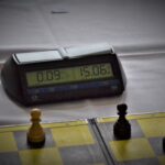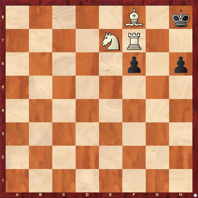 Z partie Alexandra Dudlová – Rostislav Soják mám jenom matový obrazec, na desce byly i další figury, černý měl tuším dvě věže, pěšci na obou křídlech. To podstatné ale vidíte. Saša byla na tahu a měla asi 20 vteřin. Přemýšlela a pak jen pomaličku posunula jezdce: 1. Jg6+. Černý musí 1. … Kg8 a bílé začínaly ubývat poslední vteřinky, už míň než 10 … 9, 8, 7 … vzala tedy věž … 6, 5 … a zahrála 2. Vg7 mat. Po přemáčknutí hodin se tedy 5 vteřin přidalo a na displeji svítilo 0.09. Uff.