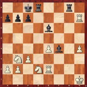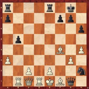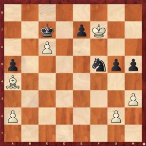 Tohle je z partie Jakub Žák – Tomáš Holásek. Bílý má sice dva pěšce více, ale černá dvojice střelců je silná a bílý král je odkopaný. Tomáš zahrál jednoduše 1. … Sxb3! Sice dává silného střelce, ale bílý už neodvrátí hrozby. Po 2. axb3 (2. Jxb3 Vd1+ -+) 2. … Sxd2 má černý figuru a bílý král je stále slabý.