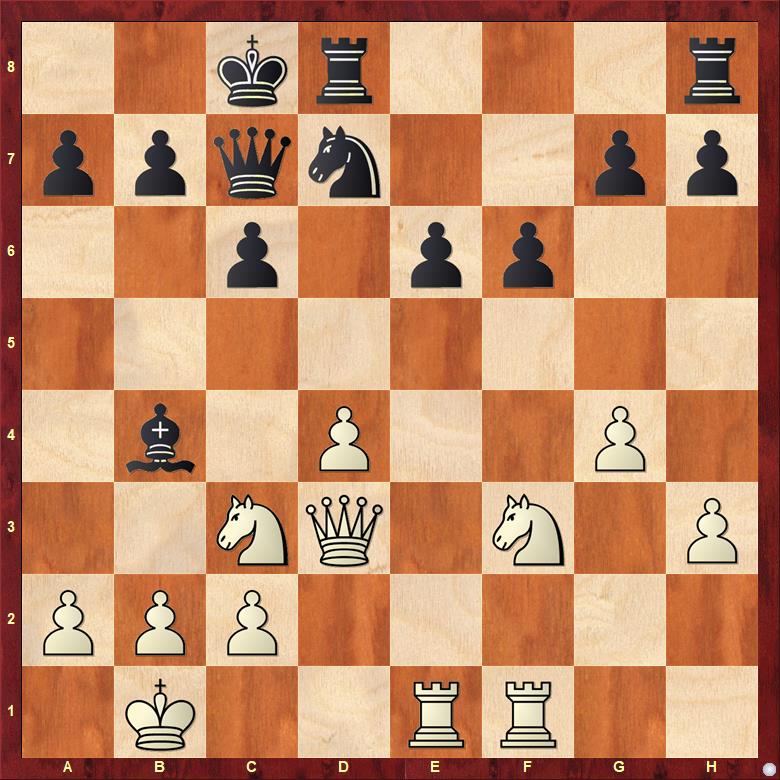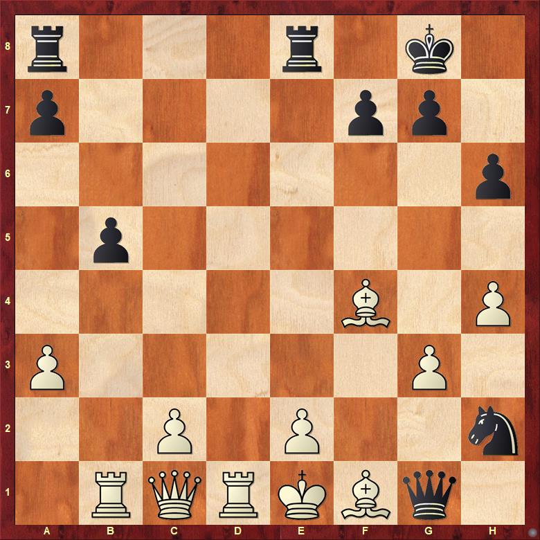 V partii Ondřej Vymetálek – Alexandra Dudlová stojí bílé figurky dost zaraženě vzadu, zejména cesta bílé věže na d1 mi vůbec není jasná, to je skoro záhada. Kdekdo by tu zahrál 1. … Dxf1+ 2. Kd2 Dxe2+ 3. Kc3 Vac8+ -+, bílý král je hnán jako suché listí větrem. Říkal jsem si, že se útěku krále dá zabránit tahem 1. … Vad8, ale bílý má ještě obranu 2. Vd3! Jenže Saša moje přemítání nad pozicí rázně ukončila tahem 1. … Jf3 mat! A jo!