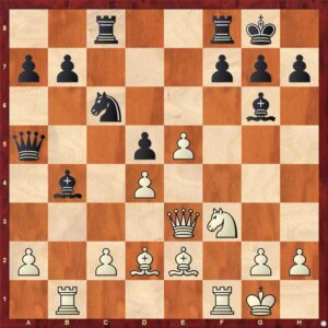 Tady jsme se s Kubou shodli, že jsme jako diváci uvažovali o tahu 23. Dc7!, compu se ještě víc líbí 23. De3! (po 23. … c5 24. d6! Dxd6? je 25. Jc4 vidle), Vojta tam ale flákl 23. dxc6!! Pointa se ukazuje po 23. … Jxe5 24. cxb7, bílý hrozí postavit si druhou dámu, po 24. … Vxb7 přijde 25. Vc8+ Df8 26. Vxf8+ Kxf8 27. Vxb7 Jxf3+ 28. Sxf3 Vxa2 29. Jc4 se zdravým pěšcem a aktivními figurami. Černý dal 24. … Jxf3+ 25. Sxf3 Sf5? 26. b8D+ a záhy stál na prohru.