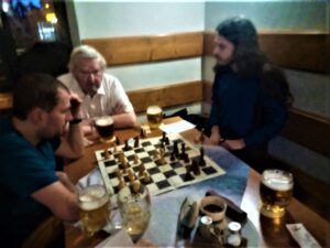 Dále se hrálo houževnatě, bez dalších rychlých výsledků, ale někde už se rýsovaly tendence, jak asi bude zápas vypadat: paradoxně jsem nejlíp stál já na jedničce, zajímavě Vašek, oba ovšem proti velmi těžkým soupeřům, naopak Jarda stál pasívně, Kuba a Vláďa bez pěšce.