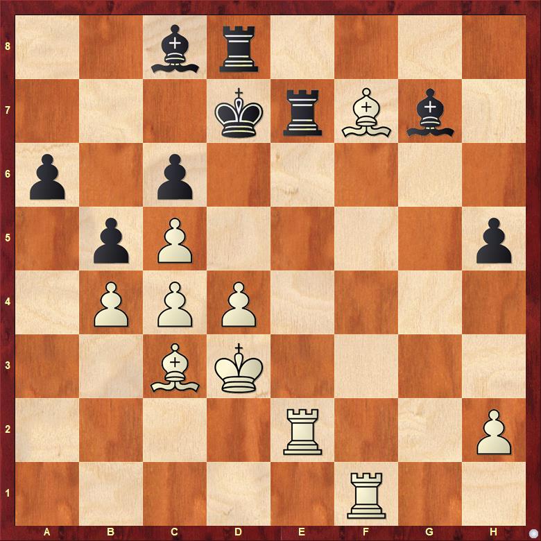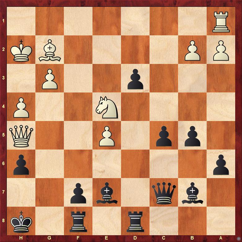 Hrozí Dxh6+ a pak Jf6+ nebo Jg5. Původně zamýšlené 27. … Vd4 nejde pro 28. Dxh6+ Kg8 29. Jg5 Sxg5 30. Dxg5+ =. Nestačí ani 27. … Db6 pro 28. Jf6 =. Pak jsem počítal různé možnosti, jak odevzdat střelce za utlumení útoku, např. 27. … Sxe4 28. Sxe4 Sg5 29. hxg5 f5, ale bílý vezme mimochodem a už hraje na výhru on. Řešení je přitom kouzelně jednoduché, Kolumbovo vejce: 27. … Dc6! -+. Jezdec je ve vazbě a v klidu přijde Dg6, hotovo. Zpětně nechápu, jak jsem to mohl nevidět, ale prostě jsem nedokázal překročit poznávací bariéru, periferně jsem pořád viděl Jf6 se šachem, přece nepolezu dámou pod toho střelce. (Pro úplnost dodejme, že vyhrávalo i 27. … Sxe4 28. Sxe4 Db6, oba ty tahy jsem zvažoval, ale ne v téhle kombinaci. Zahrál jsem jen 27. … Kg7?? a zopakoval pozici.