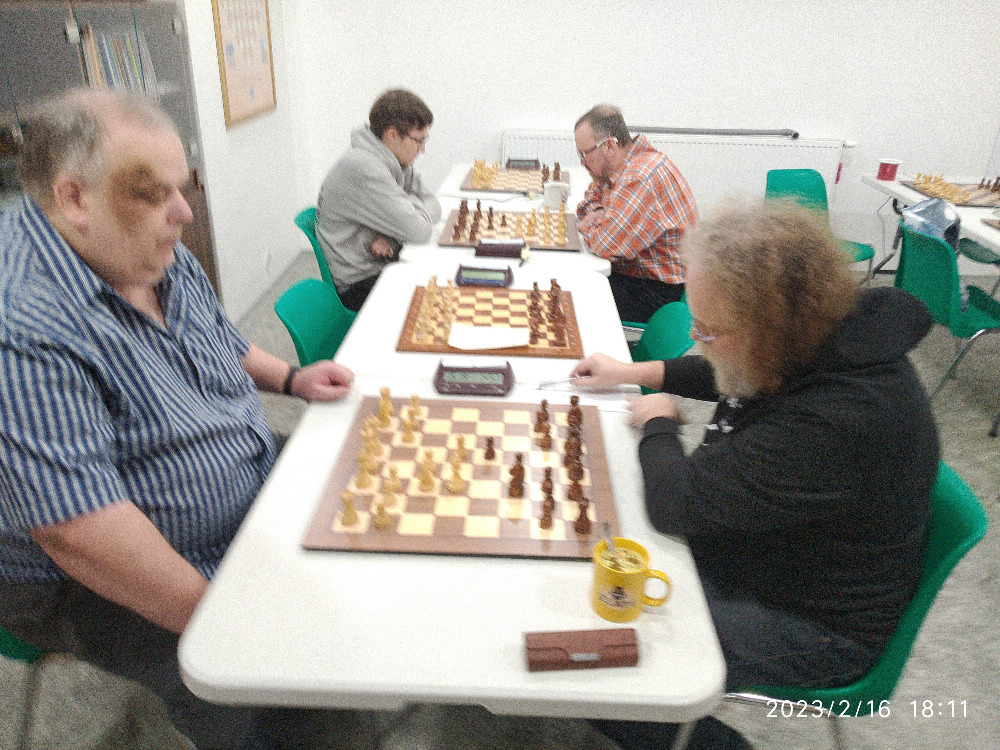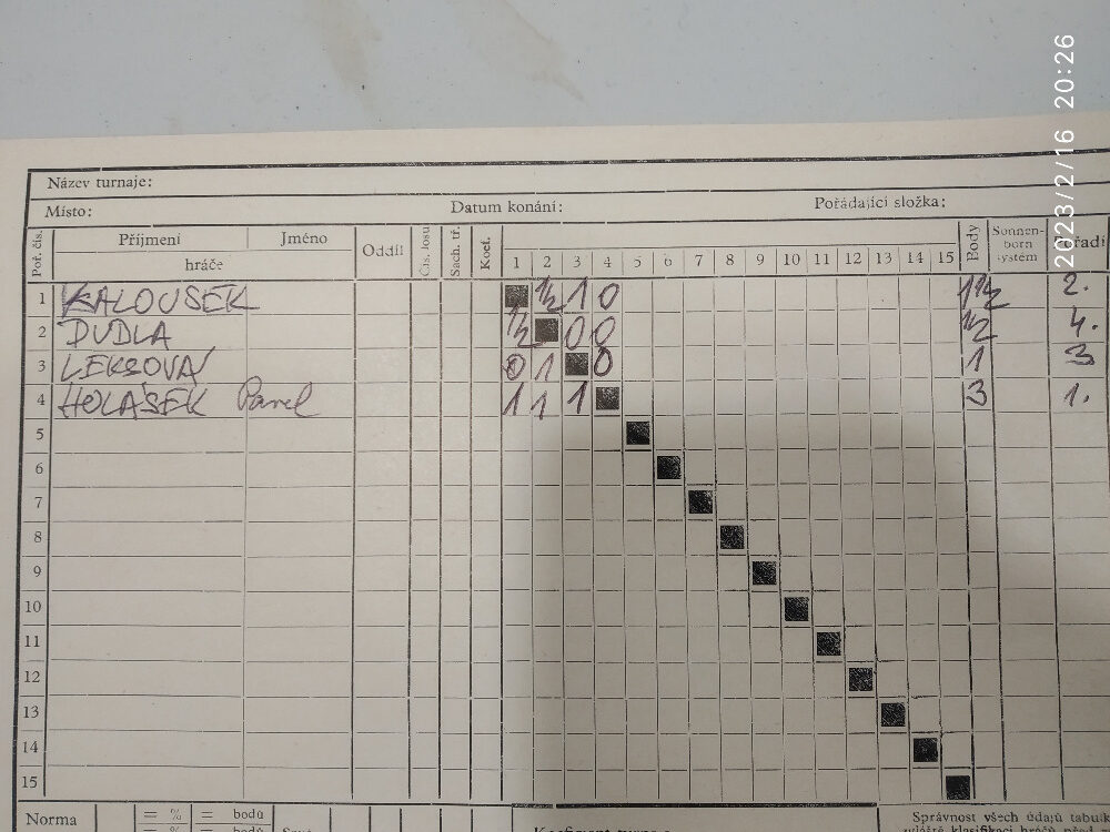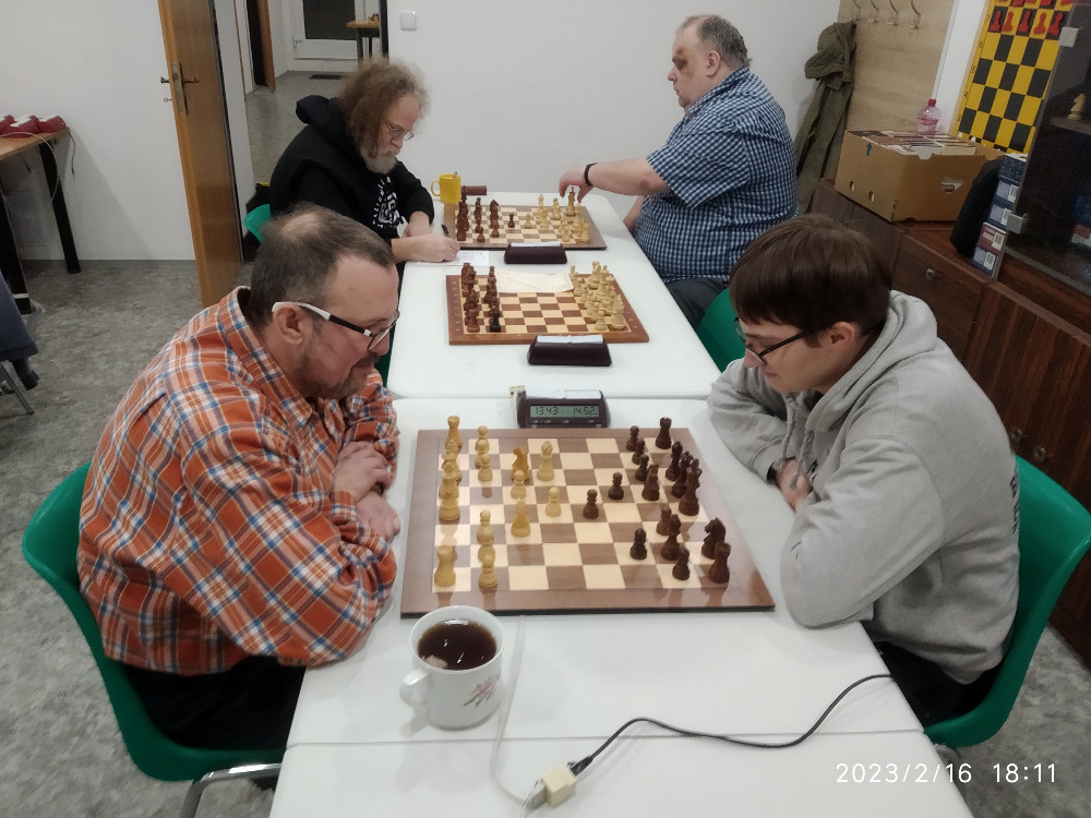 Sešlo se nás všeho všudy pět. Včetně jednoho nehrající diváka. Systémem každý z každým, časem 15+5, jsem se domníval, že za půldruhé hodiny bude odehráno. Ouha. Ačkoliv jsme začali hrát krátce po šesté hodině večerní, skončili jsme přesně o půl deváté. Za mě v tak akorát správný čas. Dovedl bych si ještě představit hrát jednu, maximálně dvě partie. Logicky mi vychází, že nechceme-li příště nad šachovnicí sedět do pozdních nočních hodin nebo hrát švýcarem, je optimální počet hráčů 4-6.