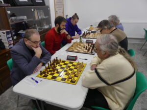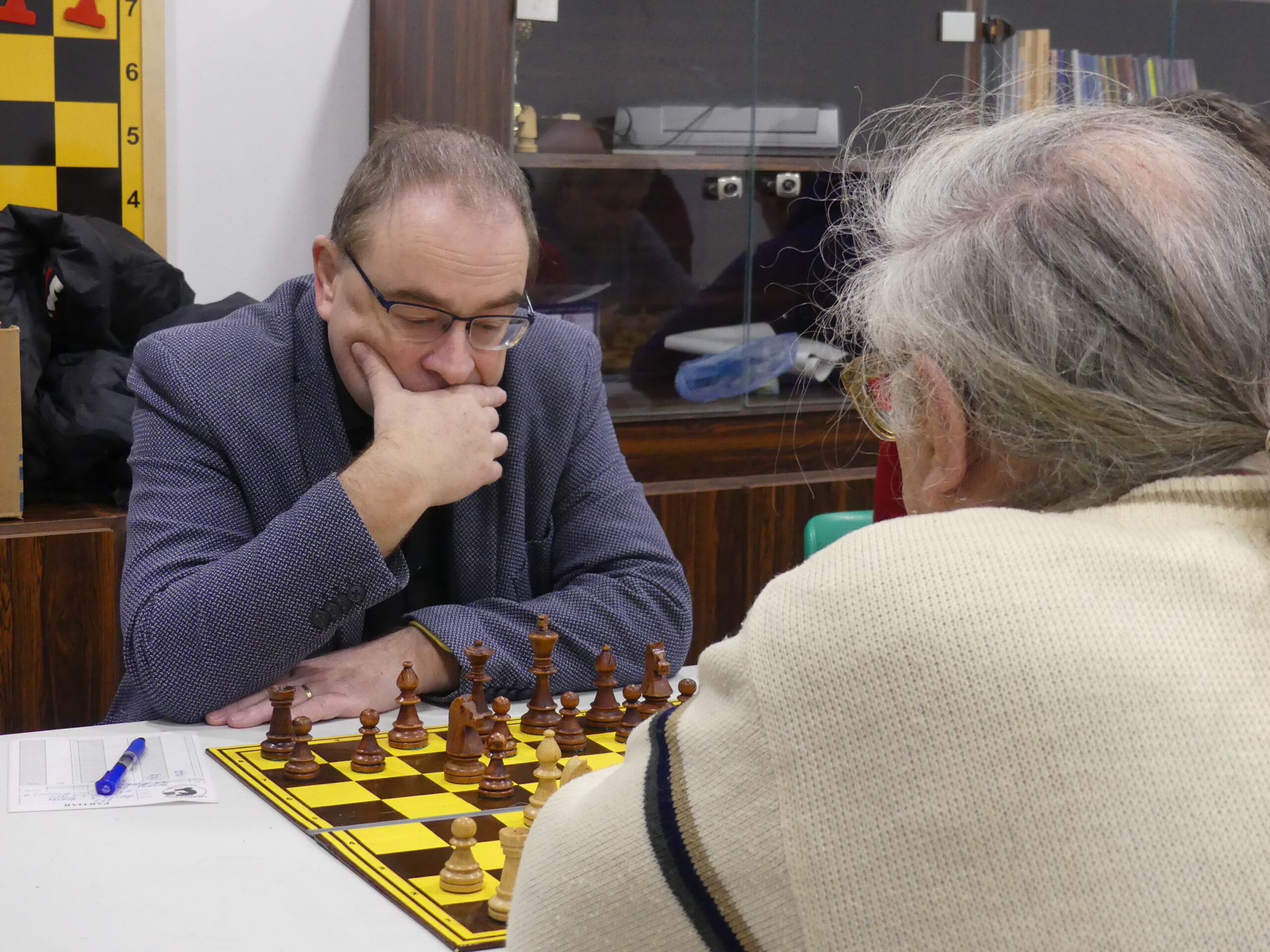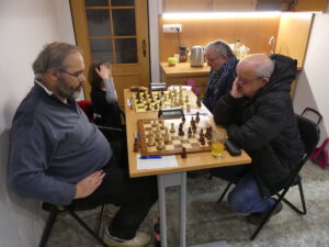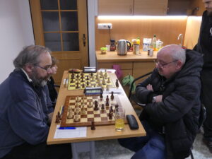 Víglaský Jaroslav-Myška František 1/2 Soupeři se potkali už podruhé v sezoně, tentokrát o soutěž výš. Jarda nic nekomplikoval, v nějaké „italovídeňce“ se normálně vyvíjel a pak po výměnách najednou získal zdravého floka. Po dalším ředění figur to byla celkem nesložitá technika, náš velmi úspěšný náhradník už se možná viděl s bodem doma, ale nenašel správný plán – volné háčko nechal moc dlouho ve stáji. Černý si obranu ulehčil výměnami na dámském křídle, kde nezbylo nic, a na královském už jen falešné háčko, které při jezdci proti střelci ani náhodou prosadit nešlo. Remíza to objektivně byla dlouhou dobu – jen upozorním, že remíza se: 1. nenabízí na čas soupeře, 2. už vůbec se nenabízí několika větami kalibru (parafrázuji): „Zase zkusím nabídnout remízu, která to teoreticky je, i když to ještě může dopadnout jakkoliv.“ PS: Neanalyzujeme nahlas, když vedle vrcholí časovka v poslední partii zápasu!