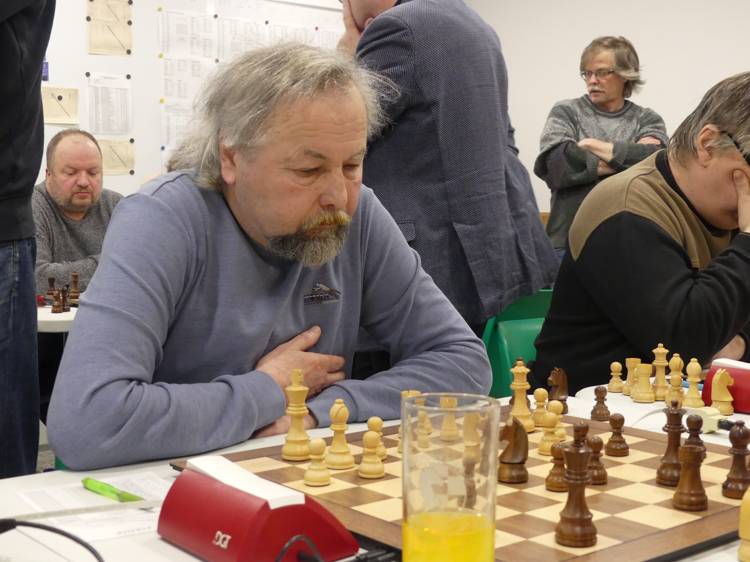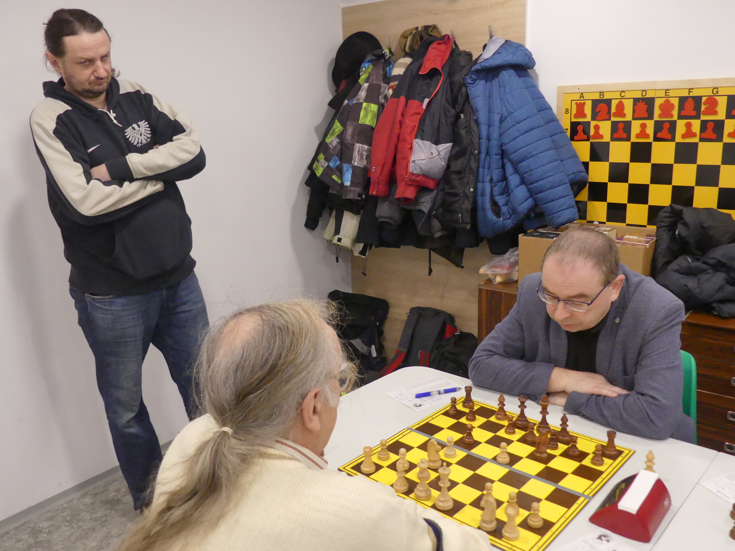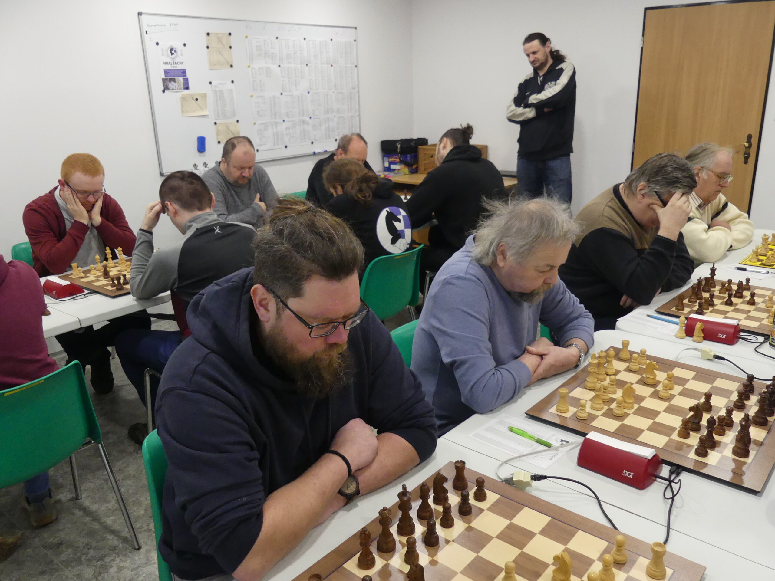 Skládání sestavy vypadalo nejdřív naprosto pohodově – podruhé mám k dispozici úderné trio vepředu, druhý zápas by měl odehrát náš navrátilec Štěpán Blaško, do zbraně se hlásí hned několik náhradníků, pohoda jazz… Jenže ouha, k šesti již jistým najednou schází dva zbylí! Do hry vstupují nemoci (Štěpán, Martin, Soňa) i jiný program vesměs již avizovaný (Dušan, Tom, Marian), najednou musím otravovat již omluvené a shánět, kde se dá. Ve středu potvrzuje nominaci dosud stoprocentní Jarda, dva dny před výkopem přichází verdikt ve věci Sonina bacilu – žel tentokrát vítězí. Naštěstí mám v aktivní záloze starostu Petra, který je ochoten obětovat volnou neděli na oltář mančaftu, pročež v pátek po obědě dostává povolávací rozkaz. V sobotu večer si ordinuji odpočinek bez šachů, jenže přichází ještě jedna jobovka – áčku ochořel na záchranářský duel Petr Jániš a Martin potřebuje najednou Verču, tzn. byli bychom bez první šachovnice! Následuje série zoufalých telefonátů, nikdo nemůže… až na poslední chvíli se objevuje spasitel Netík, původně omluven, který je ochoten osedlat druholigové figurky. Ufff…