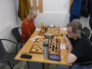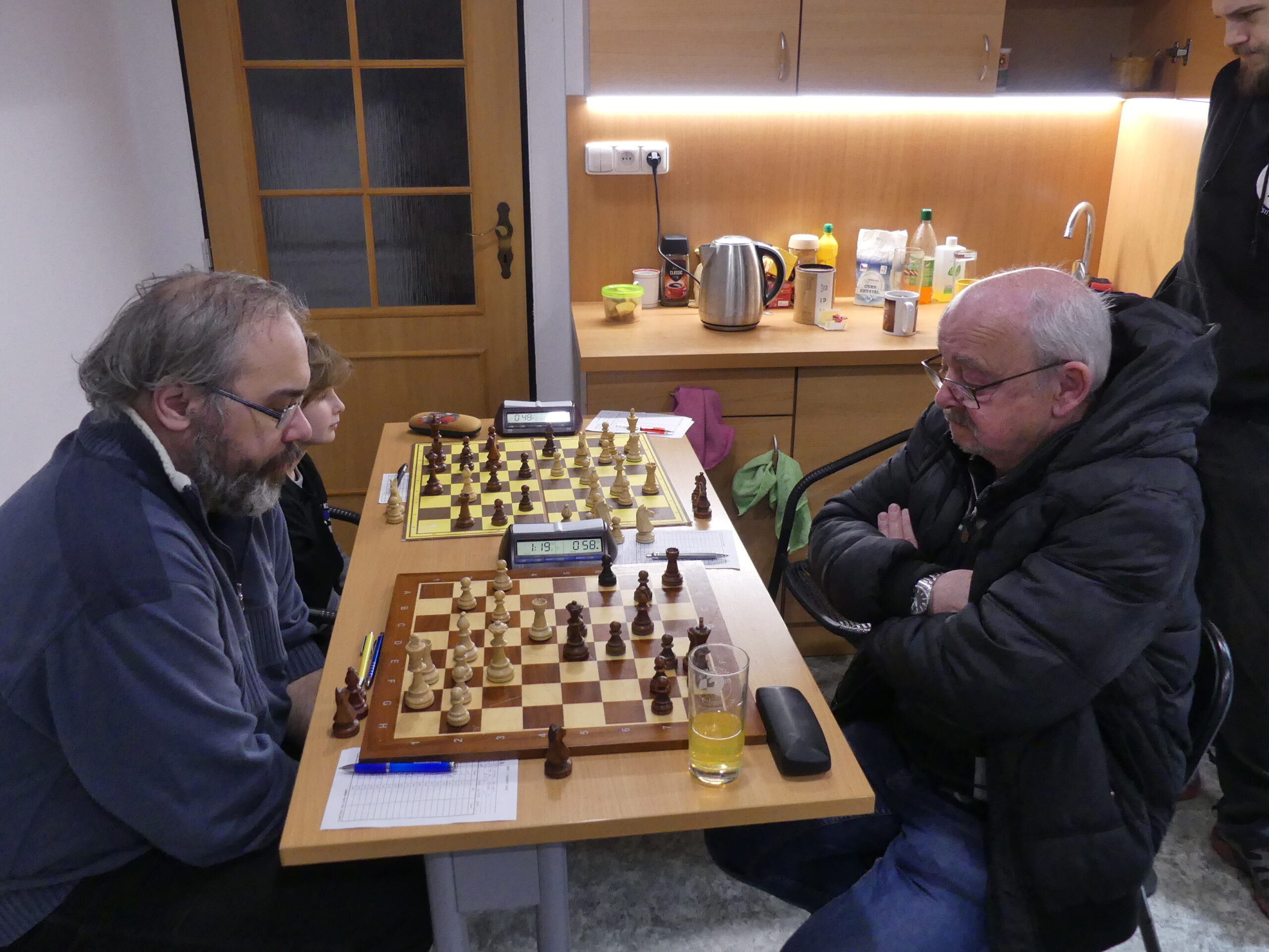 A k zápasu – ona to byla skutečně těsnota, kolem časovek se rozhodovalo. Opět si myslím, že neklamu, partie jsem prošel úplně všechny. Co jsme získali na čtvrté (Jirka), jsme ztratili na páté (já). Na sedmé se to nejprve přelévalo (z mírné bílé výhody do mírné černé), v klíčové pozice už ale bojoval o remízu jen černý – a Jarda vyhrát mohl.