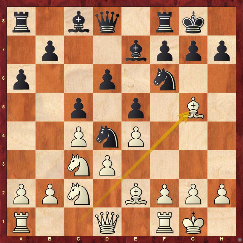 Tady právě bylo 10. Sg5? chybné, přišlo 10. ... Jxe4! 11. Sxe7 Jxc3 12. bxc3 Jxe2+ 13. Dxe2 Dxe7 s výhodou černého.