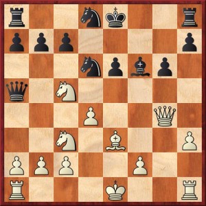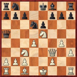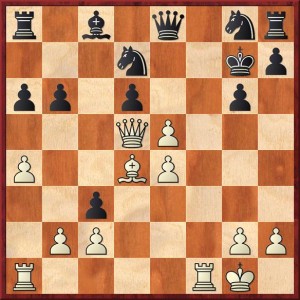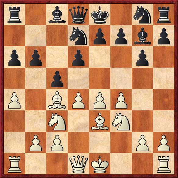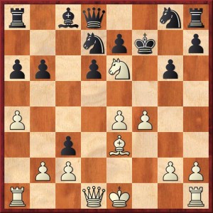 Jak jsem zjistil doma, několikrát již černý nachytal silné hráče na variantě 12. Jxf7 Jxf7 13. Dxb7, která vede zdánlivě k ziskům bílého, ale ve skutečnosti vede k nepřehledné, dynamické pozici s útočnými šance černého. Proto jsem si našel jako nejlepší pokračování 12. Se3, na které soupeř nezareagoval přesně (sám po partii říkal, že je zvyklý jen na Sd2 a bránil se v podstatě stejně, což vedlo do záhuby.  Po 12. … f6 13. Jd3 Jc6?! 14. Jc5! přišlo první šlápnutí vedle … Jd8? (lepší bylo asi obětovat pěšce a zkusit se alespoň dovyvinout – 0-0-0 ) 15. g5 se mi líbilo jako aktivní tah nenechávající černého vydechnout a otevírající další pole působnosti pro dámu. Počítač by prý radši udělal 0-0 a šušnil to na materiál…