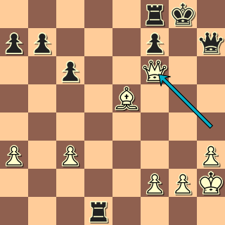 Černému vlastně nic nehrozí, ale nechat bílému rentgen po černé diagonále, to je nepříjemné. Proto 5. … Vd5! (Nebo 5. … Ve8!) Střelec je tu tak silný, že má smysl dát za něj věž, vždyť černému ještě věž zbyde. 6. Dg5+ Dg6 a bílý se vzdal, jeho útok skončil. 0:1