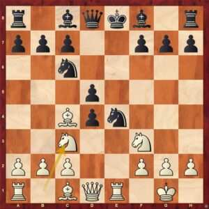 Potom jsme se vrátili k hlavní variantě, tedy 5. … Jxe4 6. Ve1 d5, a Saša navrhla tah, který jsem sám chtěl ukazovat, totiž 7. Jc3!!?.