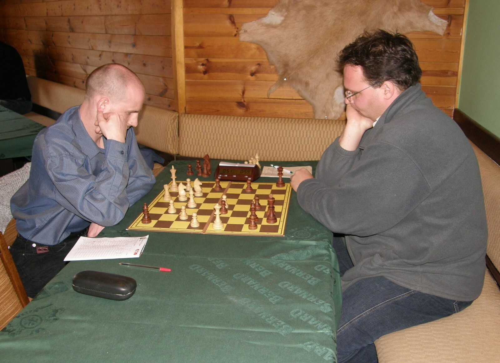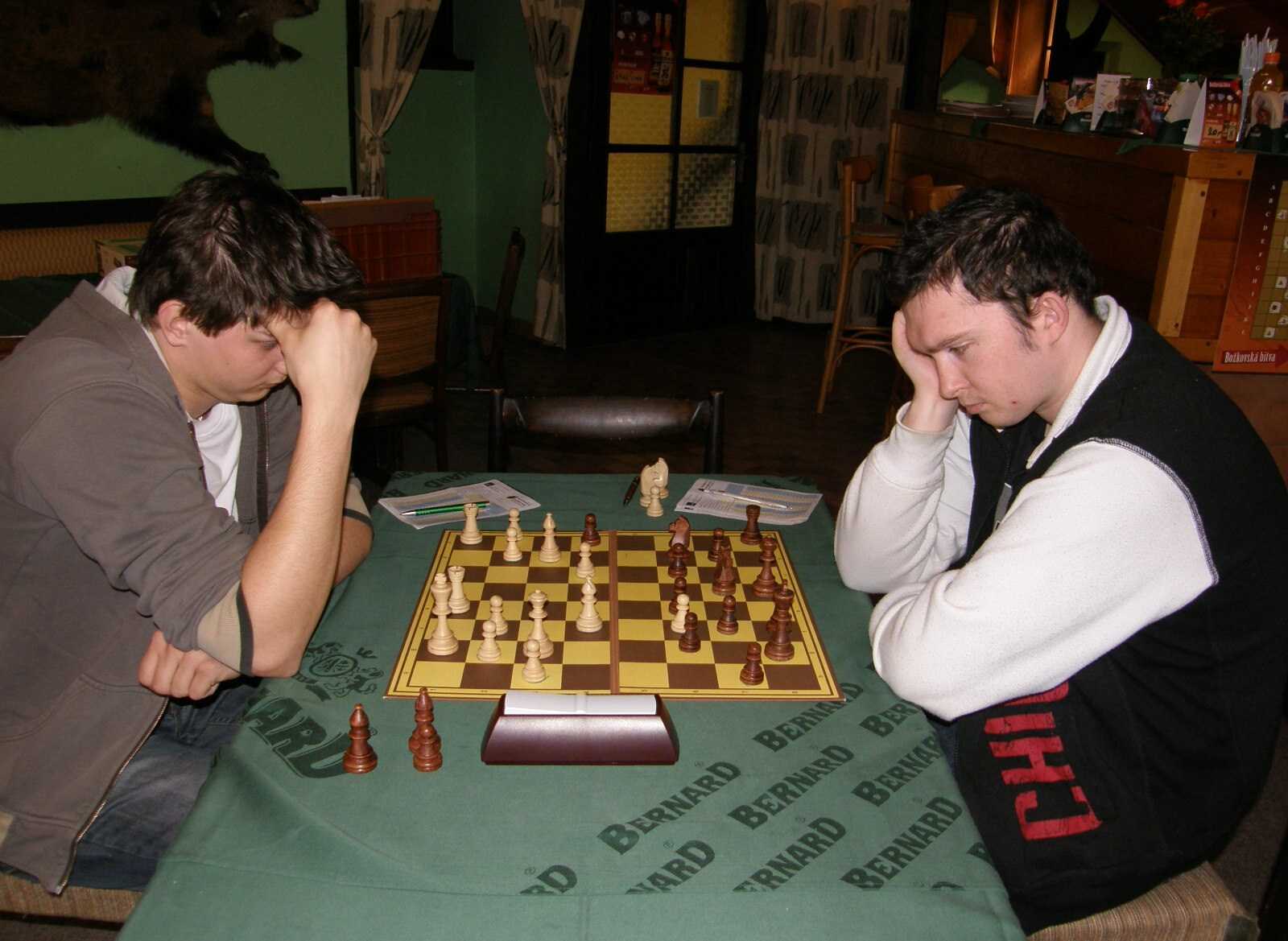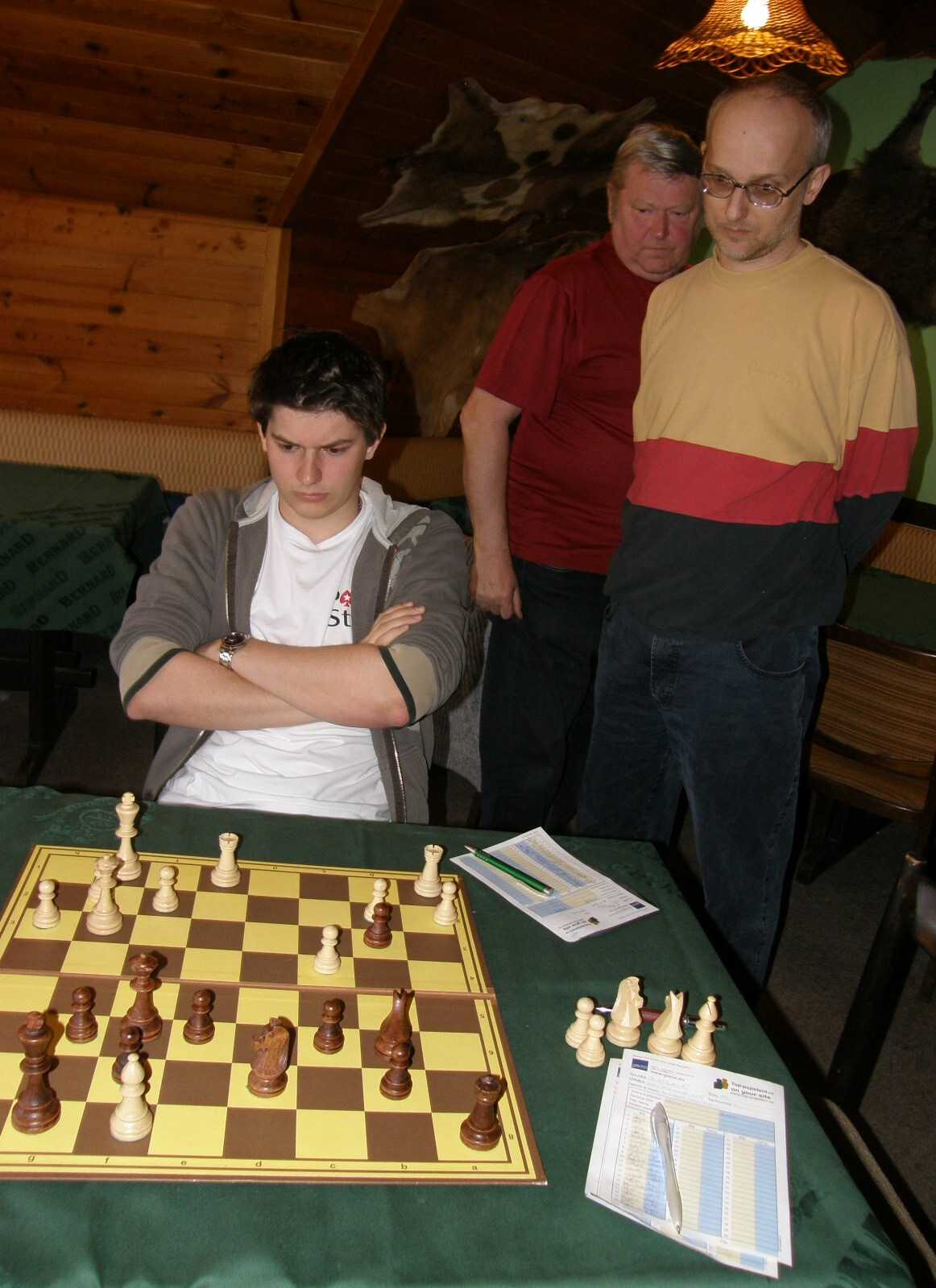 Martin Šmajzr (2161) – Michal Šrejber (2146) 1:0 Nějaká netypická zavřená sicilská, při otevřeném éčku Martin obsadil jezdcem e5, obětoval pb2 a chystal útok, černý se ale kromě dámy zaběhl na dámském křídle i koněm, přišel o něj a zbytek byla příjemná práce.