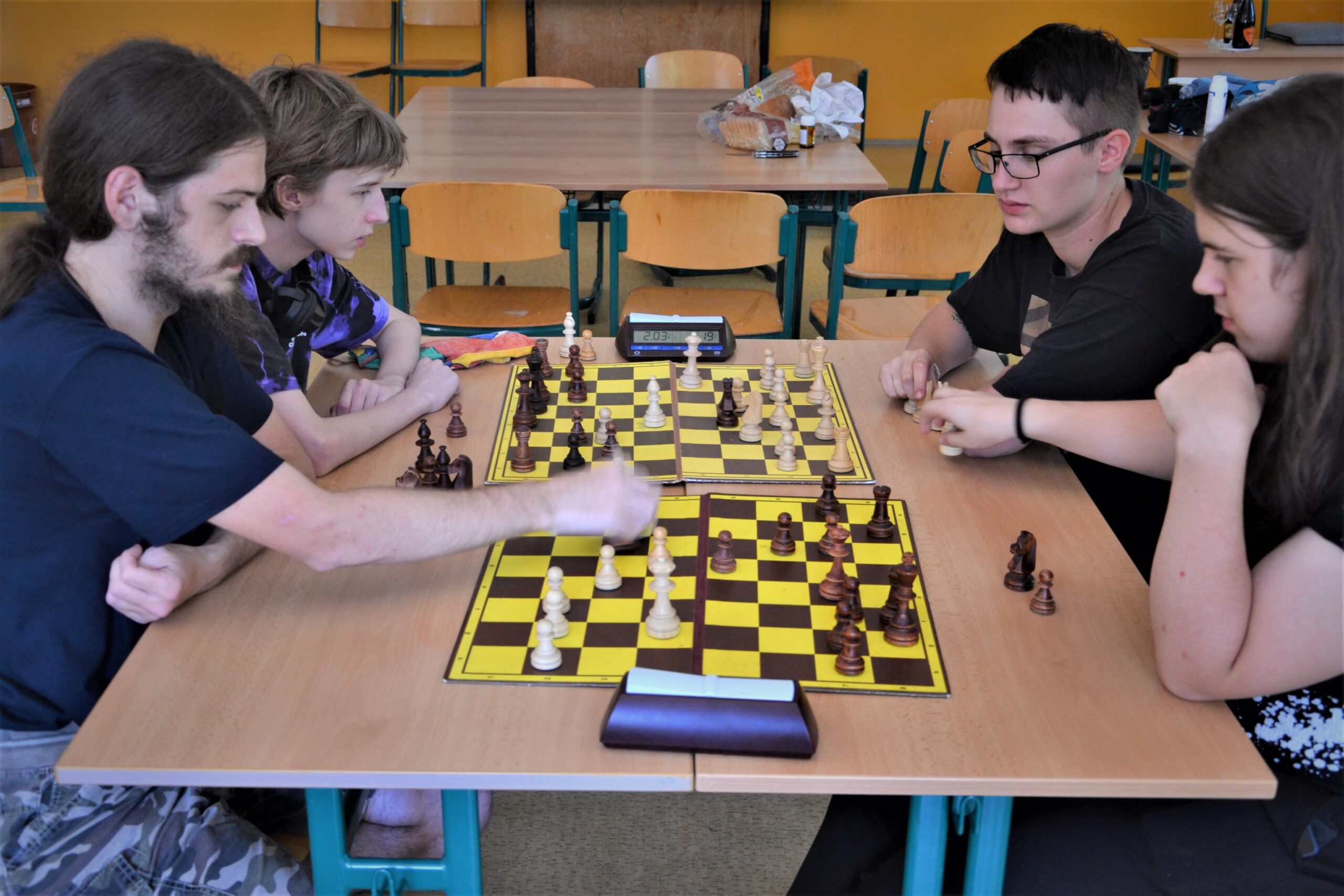 Ve čtyři je další kolo, favoritem jsem já, Vojta, Soňa, Tomáš. Matěj má německého hráče 1900+, Sam hraje se Soniným dopoledním soupeřem, doufejme, že ho utahala.
