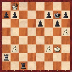 Vyměnili se další pěšci, hraje se jednoduchá pozice, bílý má k věži pc2, černá k dámě pf7. Nahrála si čas, už má přes 6 minut.