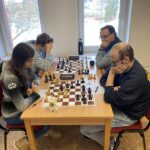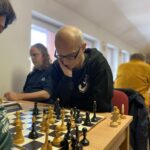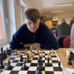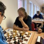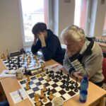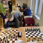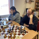 Souboj titánů. Když už Zdeněk nastoupil, čekala ho nevděčná úloha čelit černými nejsilnějšímu hráči Lanškrouna, který se už roky nechává psát na nižší desky. Zahájení neumím pojmenovat, oba hráli boudu a v centru se napadali pěšci jako v Tarraschovi, možná Grunfeld s g3? Za Zdeňka se mi to líbilo, v pohodě se rozehrál, a dokonce pak roztrhl bílé pěšce (izoláci c4. a2). Náročný boj jsem pak moc nesledoval, vznikla z toho koncovka stejnopoláků, kde měl bílý pěšce, ale nad obźorem visel strašák falešného střelce, odhadoval jsem, že se to dá nějak držet. Tomáš to však navzdory nedostatku času nakonec vymyslel, na rozbor jsem zvědav. 1:0