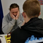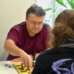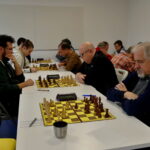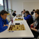 Příště jen musíme jinak rozmístit stoly, bo zejména déčko s Čermnou v pralese se silně mačkalo nejen na šachovnicích. Myslím, že místo třinácti stolů (pro každou šachovnici jeden) a tří dlouhých řad stačí stačí na šířku postavit tři řady po třech stolech. Na šesti kápéčko (8 šachovnic) a na třech káes (na 5 šachovnic bohatě stačí). Ve finále bude mnohem víc místa, pokud to tedy na průchozí uličky po obou stranách u oken i dveří.