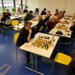 Začátek jsme časově zvládli, jen teda srovnat se v „modré“ v 26 lidech není žádná sranda a příště vymyslíme rozestavění stolů lépěji. Souběžně s námi se hrál duel o čelo KS Ústí D – Dolní Čermná, nakonec nerozhodně 2,5, typický prales, který mohl skončit jakkoliv. Nakonec naši kamarádi zápasovou plichtu spíš zachraňovali: na prvních dvou z lepších pozic jen remizovali, na třetí Martin Dudla naopak půlku zázračně zachránil. Můj kluk lepší pozici ze zahájení v útoku přepálil a zachraňovat musel na čtvrté zodpovědným výkonem v koncovce Karel Taslar.